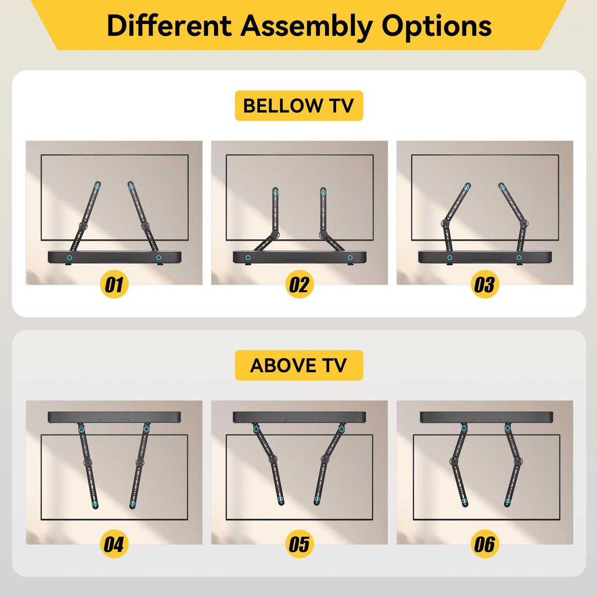 Adjustable And Universal Soundbar Mount: 1. The Soundbar Mount Pack Consists Of Adjustable Mounts And L-Shaped Hooks. 2. The Mount Can Be Connected To Tv Mounting Brackets Above Or Under The Tv. 3. The Adjustable Hooks Can Easily Change The Holding Length. Features: 1. Materials: Alloy Steel. 2.For Av Equipment And Tv Mounts With Vesa Holes Whose Diameter Is 4Mm-8Mm(0.16In-0.31In) 3. Hold Up To 22Lbs. 4. Easy To Installation. 5. Easy To Clean. Great Flexibility: 1. Fit Most Tvs With A Vesa Pattern Between 600Mm And 100Mm. 2. Compatible With Tv Mounts Of Samsung, Sony, Lg, Sharp, Vizio, Haier, Hisense, Tcl, And More. 3. Compatible With Soundbars From Samsung, Sony, Vizio, Lg, Yamaha, And Bose. About Install: 1. Clear Instructions, Numbered Parts And Necessary Tools Are Provided For Easy Installation. Please Follow The Instructions To Install. 2. You Can Also Scan The Qr Code At The Beginning Of The User Manual To Get An Installation Video. 3. If You Have Any Questions About Installation, Please Contact Our Support Team. Package Content: 1. Alloy Bracket X 4 2. L-Shaped Hook X 2 3. Screws And Nuts Needed 4. User Manual X 1 5. Installation Instruction X 1