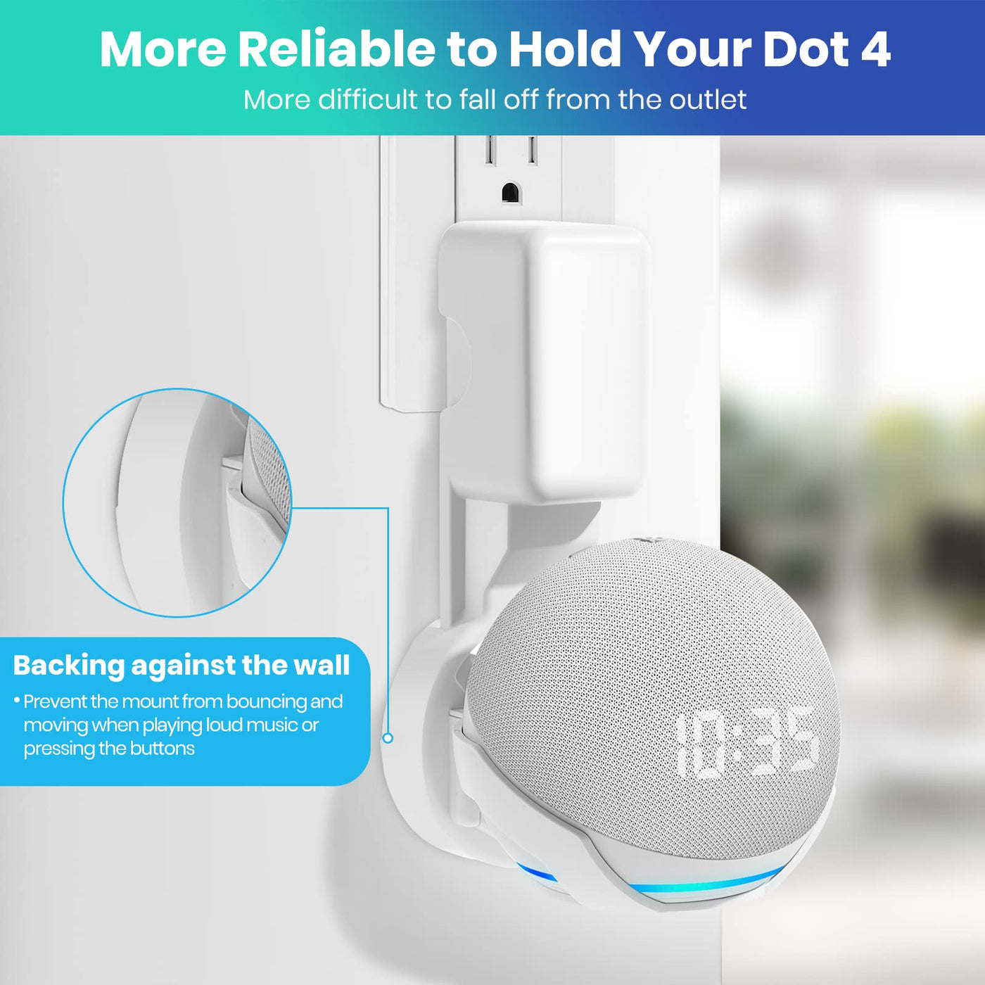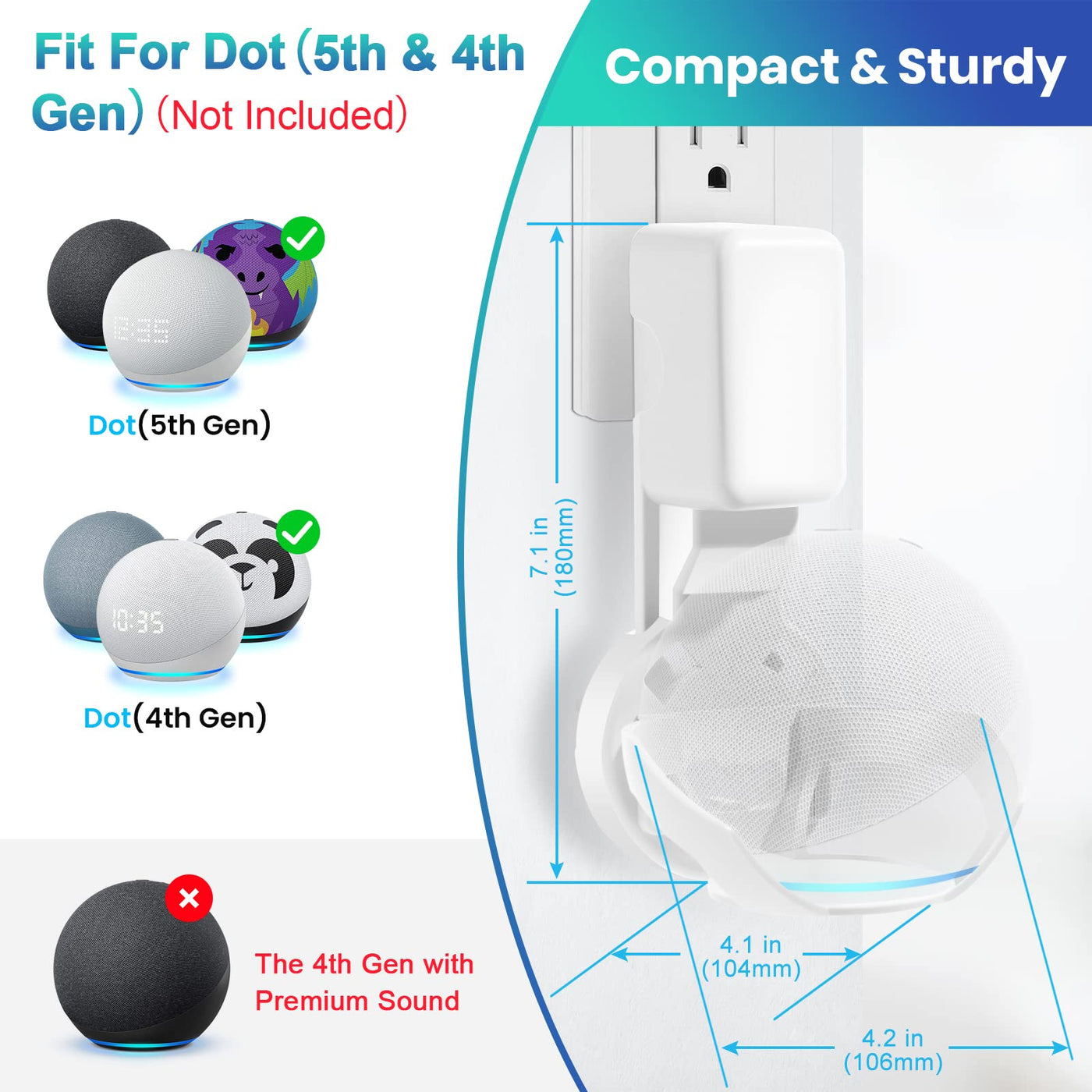 ?Compatibility? The Outlet Wall Mount Is Compatible With Echo Dot 5Th Generation(2022 Release), Dot 5Th And 4Th Gen With Clock And Kids Edition (Device Is Not Included), But Not For Echo 4Th Generation With Premium Sound. | ?Fantastic Addition To The Dot? The Outlet Holder Is Sturdy, Built Well, And Woks Great. Gets Your Dot Off Of The Counter, Frees Up Desk Space, And Sits In There With The Speakers Facing Out And Controls Upright. No Worries Of Them Getting Damaged Now! | ?Built-In Cable Management? The Power Cord And Plug Are Completely Hidden Behind, Looks Good. | ?Easy To Use? Very Easy To Assemble, Wrap Cord, And Insert Plug. The Plug Mount Stays Plugged In With No Issues With The Weight Of The Dot Device, And The Socket Above It Remains Accessible. | ?No Effect To The Sound? No Microphones And Speakers Are Blocked, Keeping The Sound Of The Original Design, Without Weakening Sound Or Affecting The Pronunciation.