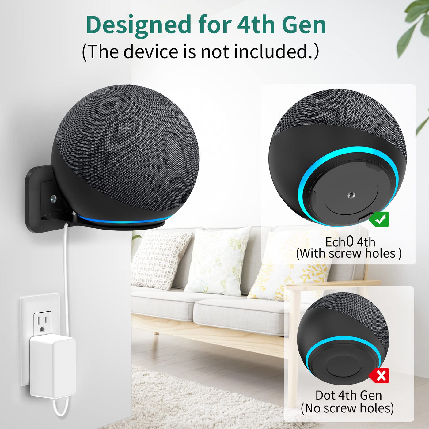 Q: How do I install the HomeMount wall mount for my Echo 4th Generation?A: Installation is simple: First, insert the power cord into the charging hole through the opening at the bottom of the mount. Next, wind the power cord around the groove on the back. Finally, align the screws with the holes on the bottom of your Echo device and tighten them securely.