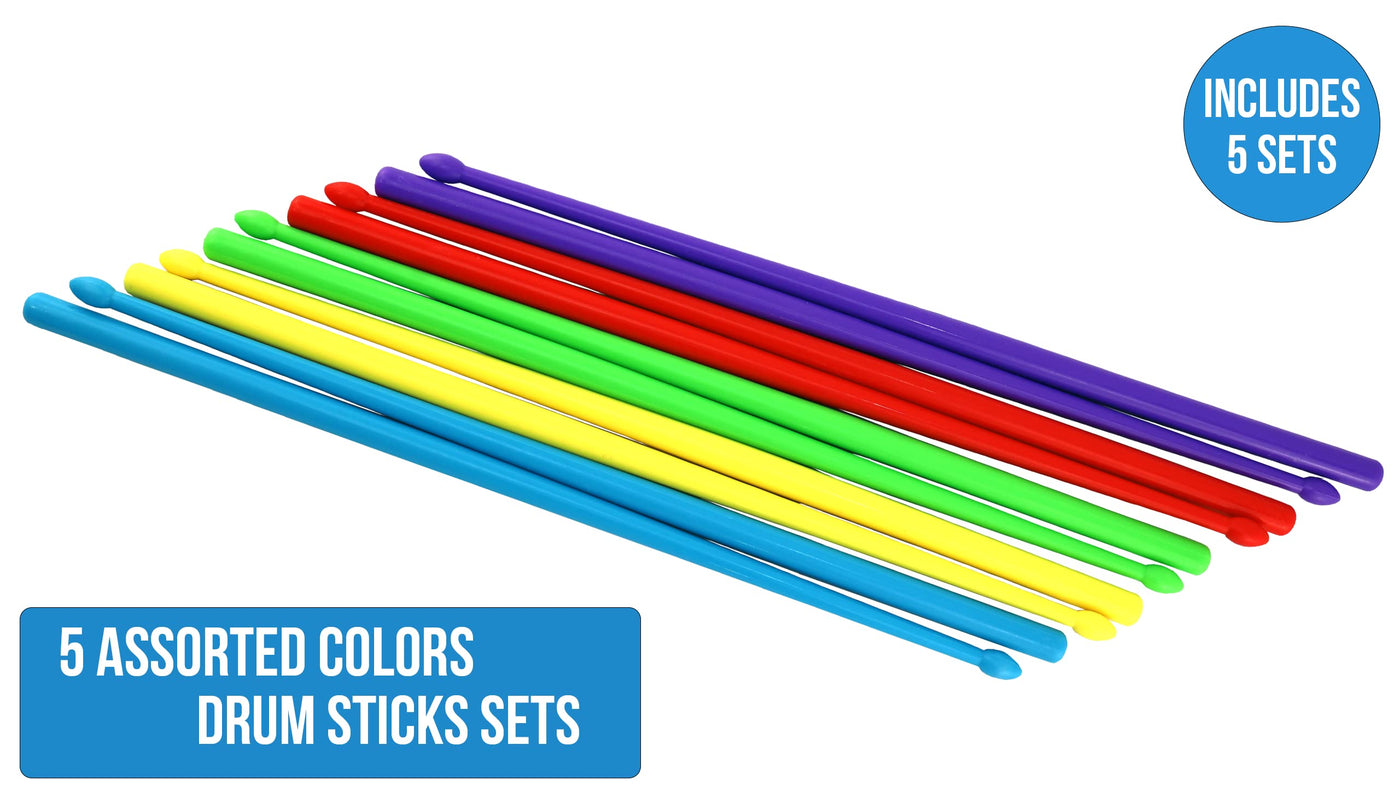 These Durable Nylon Drum Sticks Are Great For All Ages; Youth Drummer, Exercise Programs, Gym Classes, And More! Each Stick Weight 31 Grams (62 Grams Per Pair) And Measures 14.75 Inches Long X 0.5 Inches Diameter. 5 Bright Colors: Blue, Green, Purple, Red, And Yellow. 5 Pairs Of Drum Sticks.