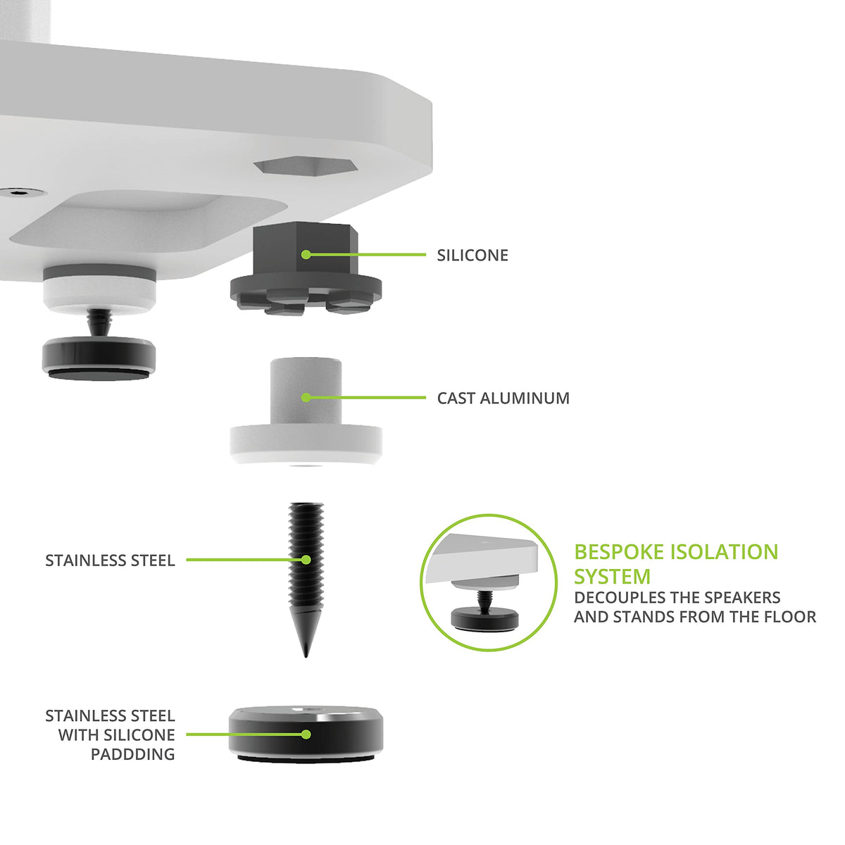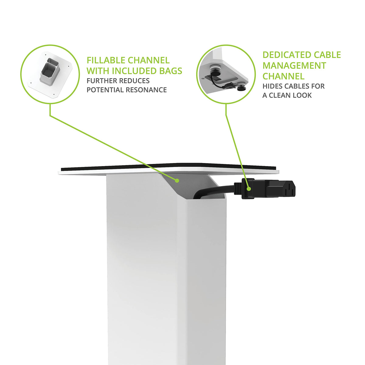 Isolating With Low Resonance - Bespoke Isolation System And Hard Floor Discs With Silicone Pads Help To Further Isolate The Speakers And Stands From The Floor. A Fillable Column With Included Bags For Substrate Reduces Potential Resonance. | Safe, Secure Design - Heavy-Duty Base Plates Lower The Center Of Gravity So Stands Are More Tip-Resistant While Added Mass Lowers The Natural Resonance Of The System. | No Mess Management - Run Multiple Thick Cables Through The Dedicated Cable Column Without Running Out Of Room Or Interfering With Fill. | Versatile Compatibility - Provides Two Included Top Plate Sizes For Compatibility With A Wide Range Of Speaker Sizes. Available In 22