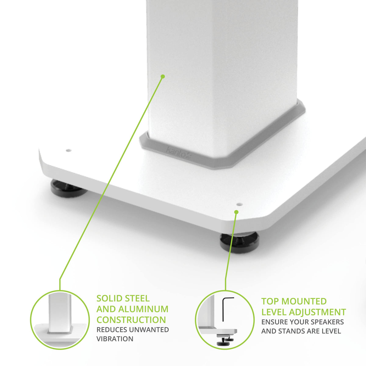 Q: What materials are used in the construction of the Kanto SX22 speaker stands?A: The Kanto SX22 speaker stands are constructed from durable metal, ensuring stability and longevity while also incorporating silicone pads and hard floor discs to further isolate and protect your speakers.