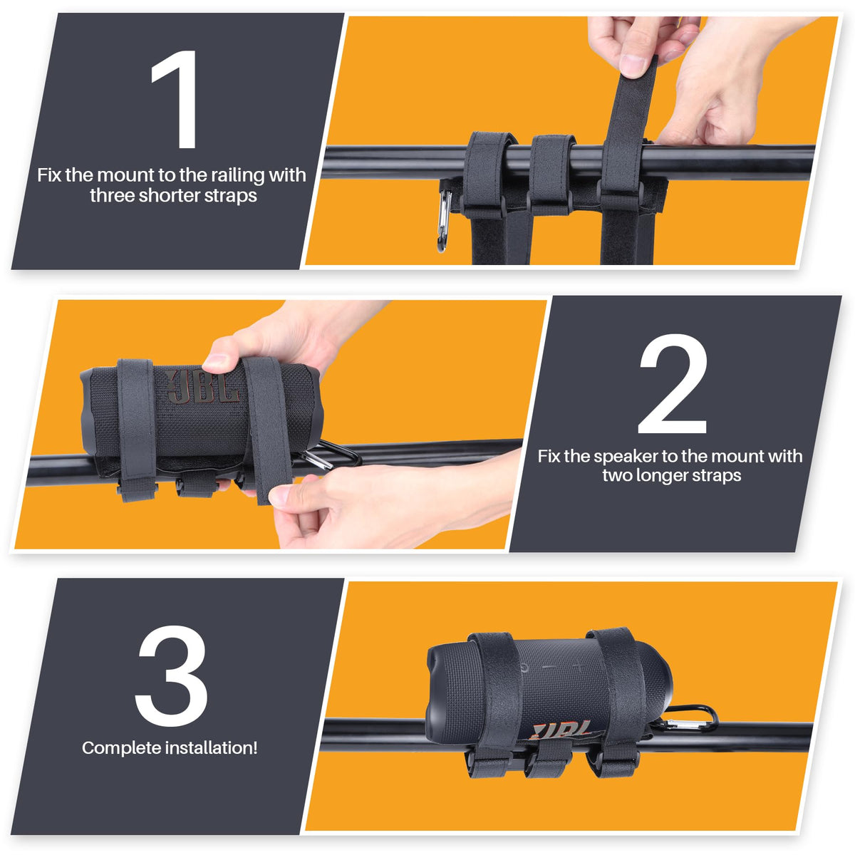 Q: Is the Lebakort speaker mount stable during movement?A: Absolutely! The mount is equipped with three adjustable nylon buckle straps and an anti-vibration pad, which help stabilize the speaker and prevent it from rattling or falling, even at high speeds.