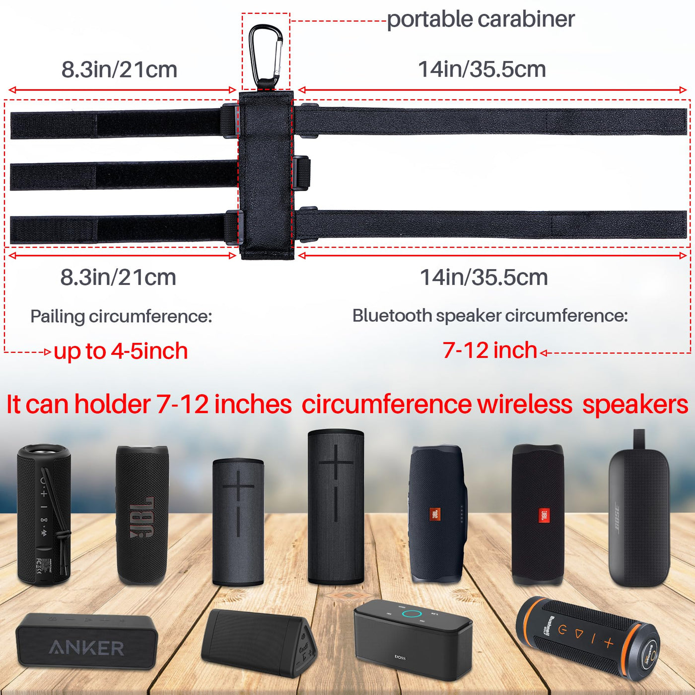 Q: What sizes of Bluetooth speakers can the Lebakort Portable Speaker Mount accommodate?A: The Lebakort Portable Speaker Mount is designed to hold Bluetooth speakers with circumferences ranging from 7 to 12 inches, ensuring compatibility with a variety of popular models.