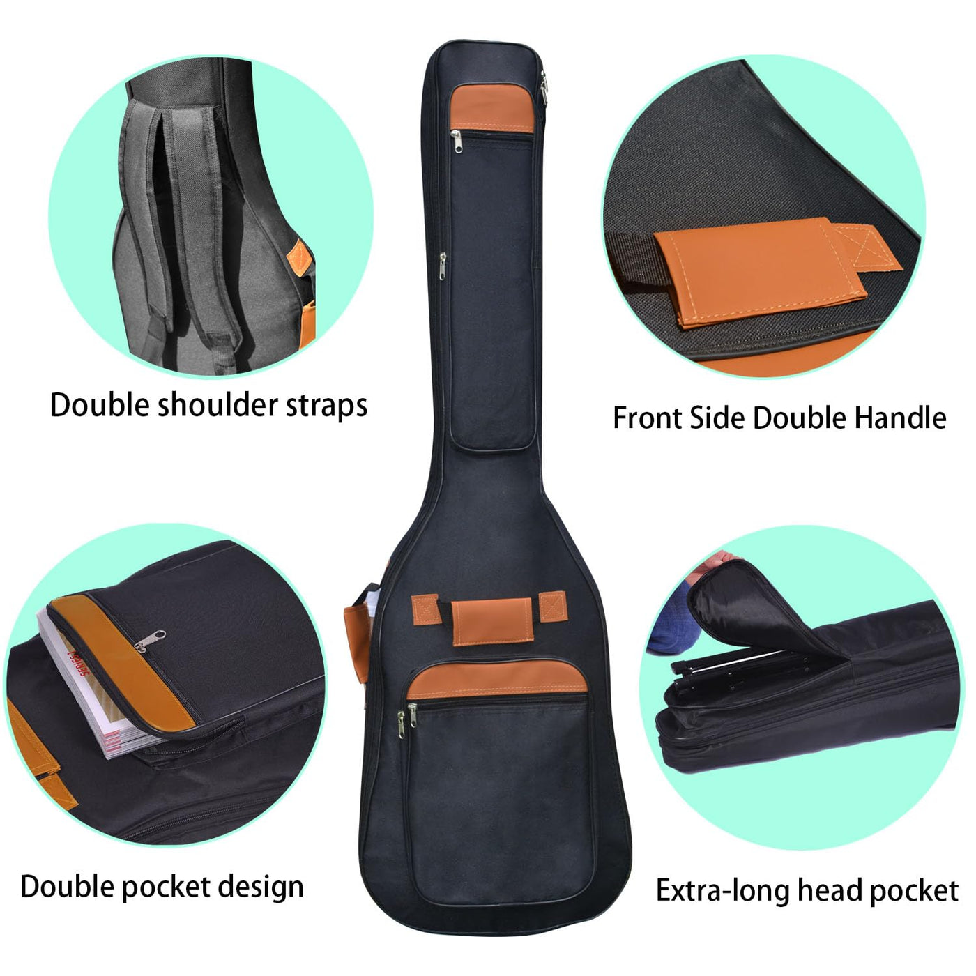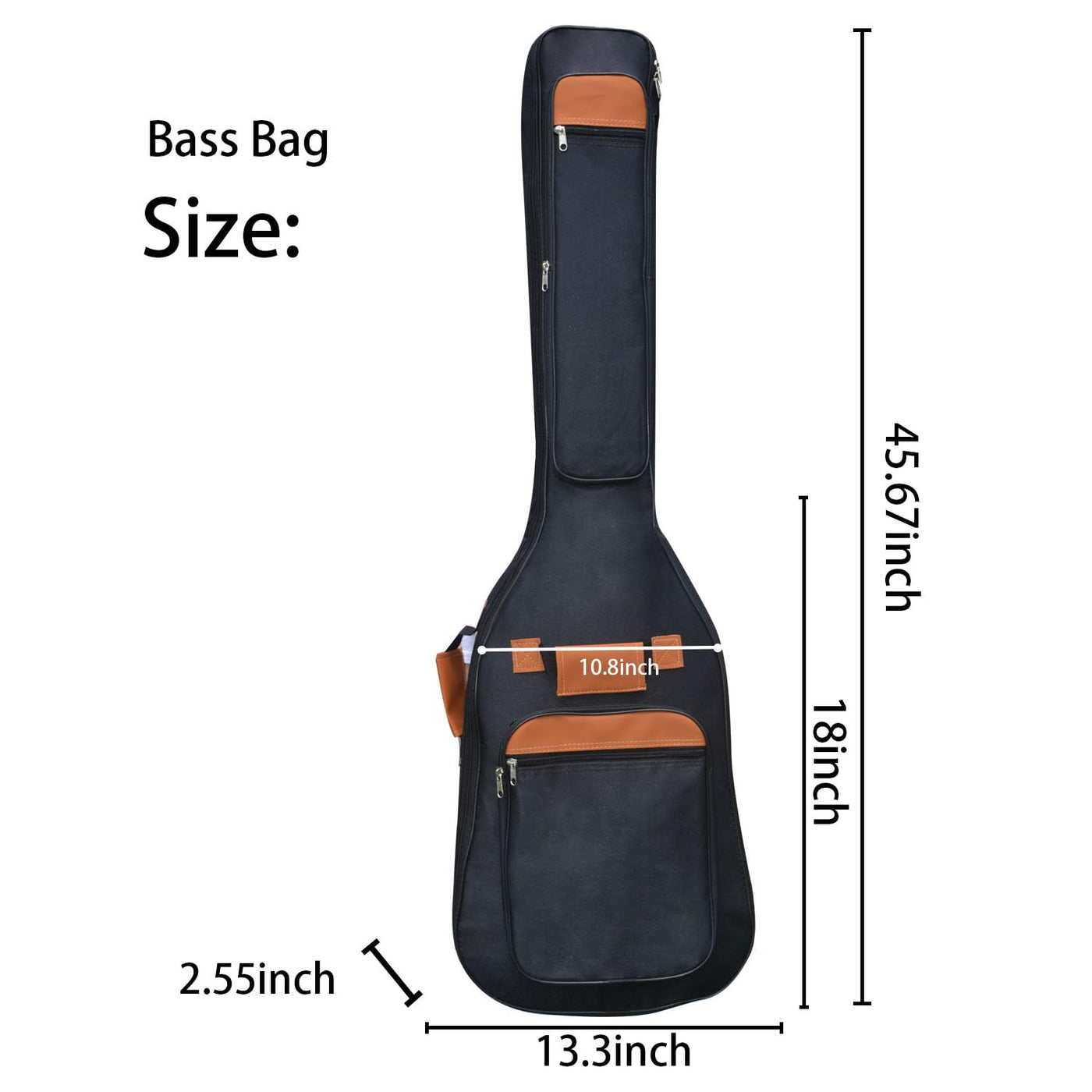 Thick Padding:Thick Sponge Can Prevent Guitar From Damage And Thick Adjustable Straps Makes It More Comfortable To Carry. Two-Way Sturdy Metal Zippers:The Electric Guitar Gig Bag Is Equipped With Durable Two-Way Metal Zippers, Sliding Smoothly And Not Easy To Stuck Or Break. 45.67 X13.3X2.55 Inch, Compatible With Electric Bass. Lightweight And Portable:Two Adjustable Shoulder Straps And Two Comfortable Side Handle Ensure Convenient Carry For Commute, Travel, And Gig. Exterior Bottom Rubber Pad Minimizes Impact When Placing Your Guitar Bag. Double Pockets Design:The Top Pocket Holds Long Items Such As A Music Stand, While The Bottomconvenient Storage Space For A4-Size Sheet Music, Strings, Tuners, Picks And Other Accessories. Material: 600D Nylon Oxford With 210D Smooth Soft Lining Fabric. Not Easy To Rip Off And Protects Your Guitar From Collision And Scratches When Storing And Transporting.