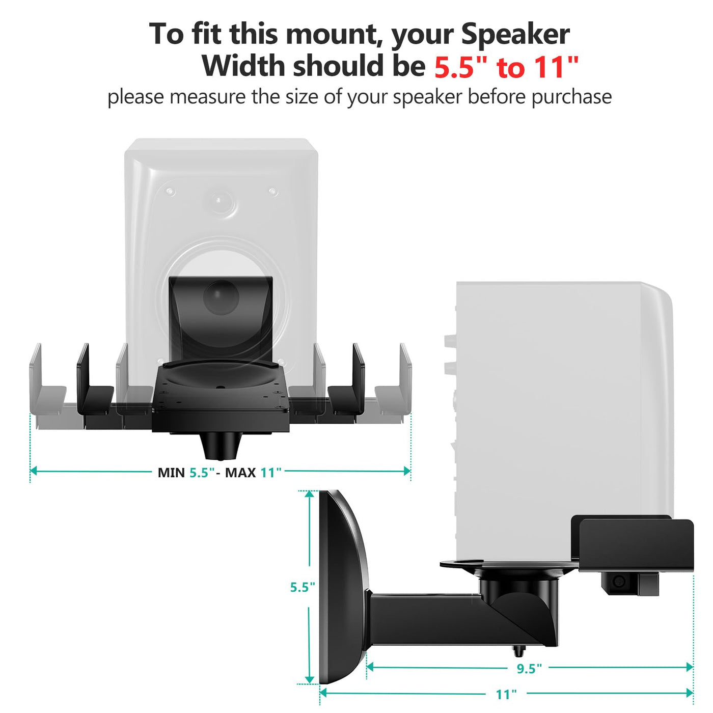 Please Check The Stands For Your Speaker: Satellite Speakers, Bookshelf Speakers, And Surround Sound Speakers With Back Wall Mount Options. Check Your Speaker Weight And Size Of Speaker, Width Of Speaker Between 5.3 To 11 Inches And Speaker Weight Less Than 55Lbs (25Kg). Product Specifications: Width Of Speaker Between 5.3 To 11 Inches. Support Speaker Weight Up To 55 Pounds (25 Kg). Tilt Up And Down 7.5 Degrees. Swivel Left And Right 45 Degrees. Large Lag Type Bolts Ensure A Strong Solid Connection To The Wall. Isolation Pads For A Solid And Vibration Free Mounting. Easy Adjustable Knob Design For Optimum Listening Angles And Immersive Surround Sound. Package Includes: 2 X Wali Speaker Wall Mount Bracket (Black) 1 X User Manual 1 X Mounting Hardware Kit