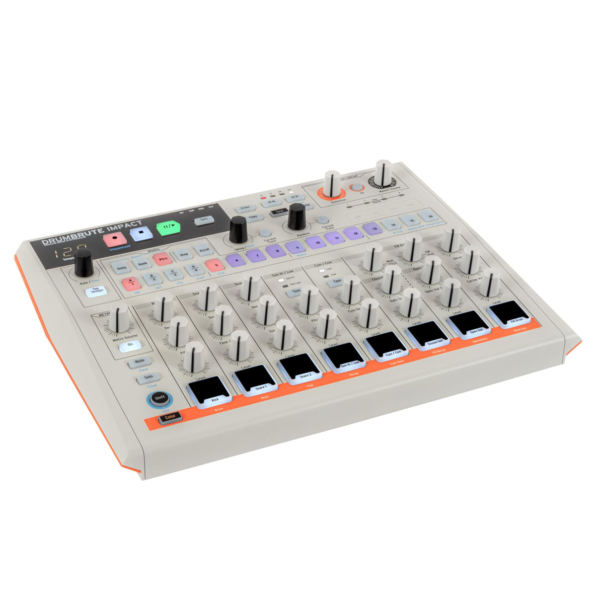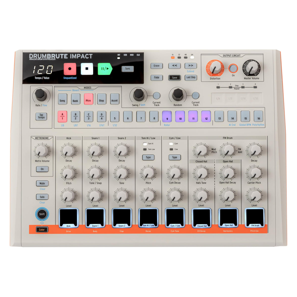 Big Drumbrute Sound In Vintage Flair Its Time To Sport The Aesthetics Of 1984 In Typical Arturia Percussive Style. Just Like Its Predecessor, The Arturia Drumbrute Impact 1984 Drum Machine Delivers Big Analog Drum Tone With Impressive Sequencing And Performance Capabilities. And With Its Versatile Sync Options &Mdash; Midi, Usb, Clock (Four Different Formats), And Internal &Mdash; Drumbrute Impact Is The Perfect Way To Add An Analog Drum Machine To Any Performance Rig. A Plethora Of Hands-On Controls Offers A Ton Of Creative Possibilities For Everything From Old-School Techno And House To Psytrance, Dub, Hip-Hop, And Much More. To Top It Off, The Arturia Drumbrute Impact 1984 Features A Built-In Distortion Circuit On The Output To Add Just The Right Amount Of Harmonic Bite.Loaded With 10 True Analog Drum Sounds And 64-Step Sequencing The Arturia Drumbrute Packs 10 Different Drum Sounds: Kick, Two Snares, High Tom/Low Tom, Cymbal/Cowbell, Closed Hi-Hat,