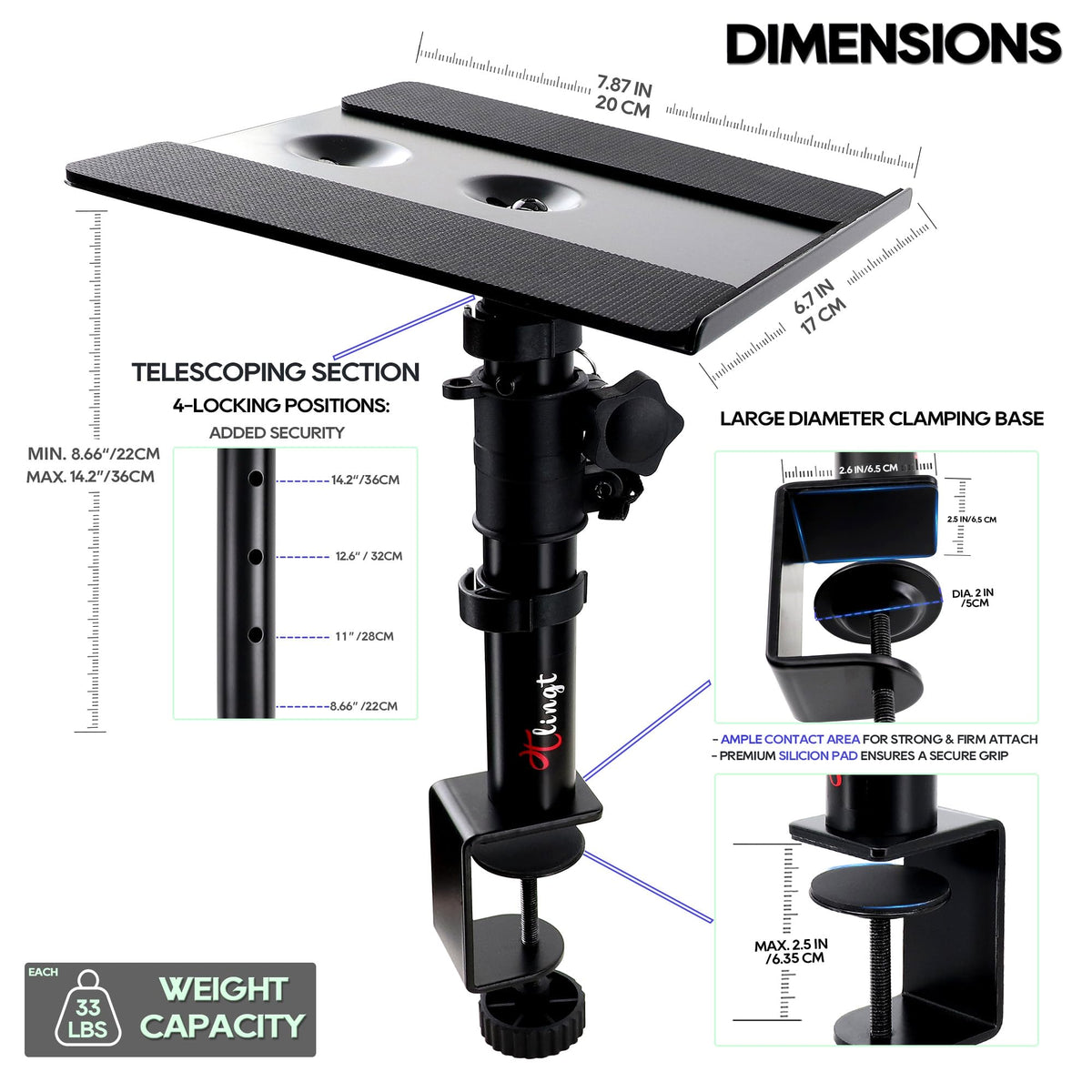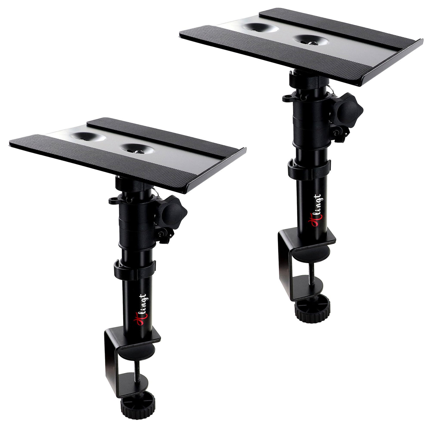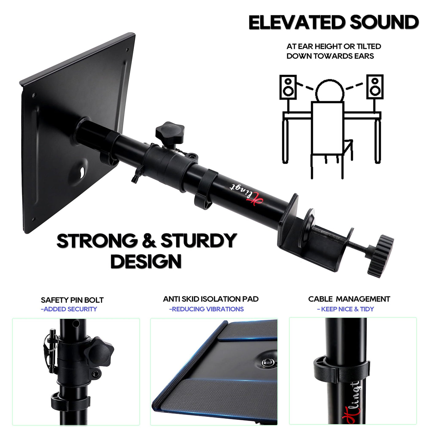 Tlingt&Nbsp;Desktop Speaker Stands Bring Your Speakers Into Better Alignment With Your Ears, Letting You Capture A Wider Range Of Frequencies.&Nbsp; Their Heavy Steel Structure And Foam Padding Further Improve Near-Field &Nbsp;Listening By Significantly Reducing Vibration, Leaving You With Cleaner,&Nbsp; More Accurate Sound. Each Stand Features &Nbsp; 4 Cable Clips To Conveniently Route Your Cables ,&Nbsp;Help Keep Your Setup Looks Nice And Tidy .&Nbsp; Versatile And Sturdy Desktop Stands For Ultimate Workspace Organization. &Nbsp; ?&Nbsp;Metal Tray&Nbsp;Tilt Angle -10&Nbsp;Up &Nbsp;To&Nbsp;+10&Nbsp;&Nbsp;Down ?&Nbsp;Height Adjusts From Min. 8.66 / 22Cm To Max. 14.2/36Cm ?&Nbsp;Anti Skid Pad Avoid Scratches &Amp; Decreases Vibrations ?&Nbsp;Weight Capacity Support Up To 30 Lbs/13.6Kg&Nbsp;Each ?&Nbsp;Elevate Your Speakers To Ear Level ?&Nbsp;Free Up More Valuable Work Space