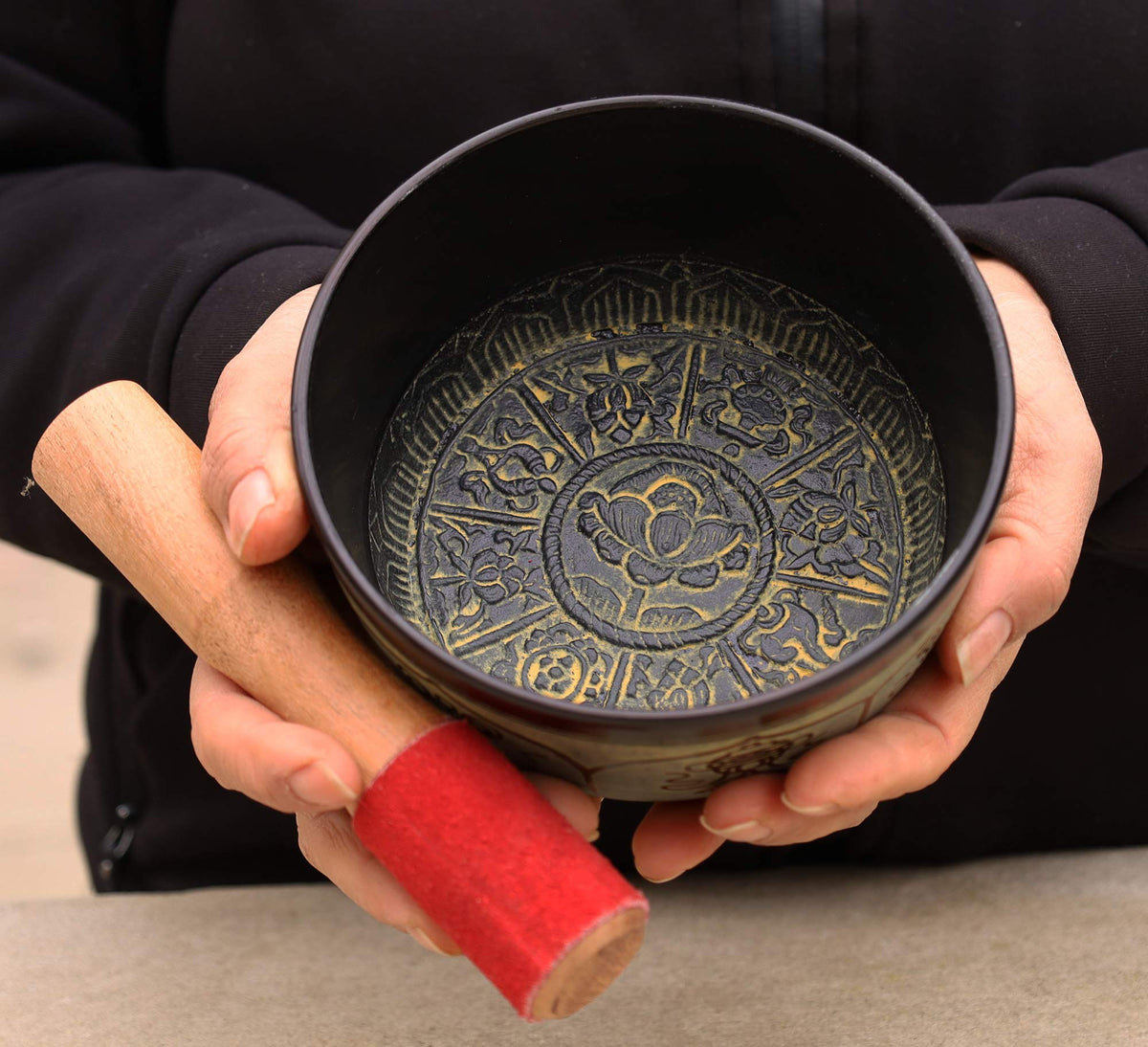 Tibetan Meditation Grade Heavy And Large Long Ringing 8 Lucky Symbols Singing Bowl Set. This Is An Absolutely Gorgeous Bowl With Great Long Ringing Sound And Sings Easily. Hand Etched 8 Lucky Symbols On The Face, Engraved And Embossed 8 Lucky Symbols Inside The Singing Bowl. In Addition To Their Traditional Usage For Meditation, Tibetan Singing Bowls Are Used For Deep Relaxation, Stress Reduction, Holistic Healing, Reiki, Chakra Balancing, And World Music. Many People Find That The Rich Blend Of Harmonic Overtones Which The Bells Produce Have A Direct Affect Upon Their Chakras.
