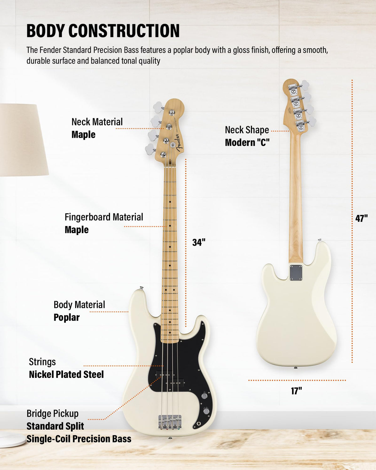 The Fender Standard Precision Bass In Olympic White With A Maple Fingerboard And Black Pickguard Is Made For Musicians Starting Their Musical Journey. It Has A Poplar Body With A Gloss Finish, Giving It Good Sound Quality And Strength. The Fender Standard Ceramic Split Single-Coil P Bass Pickup Provides Clear And Flexible Tones, While The Modern C- Shaped Maple Neck With A Satin Finish Makes Playing Comfortable. The 9.5 Radius Fingerboard Gives A Smooth Feel When Pressing Down On The Strings, And The 4-Saddle Bridge With Satin Chrome Saddles Helps With Keeping The Bass In Tune And Producing Good Sound. This Bass Is Ideal For Players Of Any Level And Offers The Classic Fender Feel In A Beautiful Olympic White Color. Body Finish: Gloss Polyurethane Body Material: Poplar Bridge: Standard Top-Load With Satin Chrome Steel Barrel Saddles Neck Pickup: Standard Split Single-Coil Precision Bass Neck Shape: Modern C Neck Material: Maple Neck Finish: Satin Urethane With Gloss Urethane Headstock Face Fingerboard Radius: 9.5 (241 Mm) Number Of Frets: 20 Fret Size: Medium Jumbo Nut Material: Micarta Nut Width: 1.625 Strings: Nickel Plated Steel Tuning Machines: Fender Standard Open-Gear With Clover Keys Hardware Finish: Chrome Dimensions: 47X17X4.1 Inches Weight: 14.55 Pounds Austin Bazaar Appreciates Your Purchase By Adding Essential Accessories. This Bundle Contains A Guitar Strap For Comfortable Support And A Guitar Cleaning Kit Comprising: Speed Slick String Cleaner, Super-Soft Dual-Sided Microfiber Cloth, Fender Factory Microfiber Cloth And A 4-Pack Custom Shop Deluxe Guitar Care System To Keep Your Instrument In Mint Condition. Includes An Austin Bazaar Instructional Video To Provide Tips And Guidance For Learning Your Instrument. Warning: Cancer And Reproductive Harm - Www.P65Warnings.Ca.Gov.