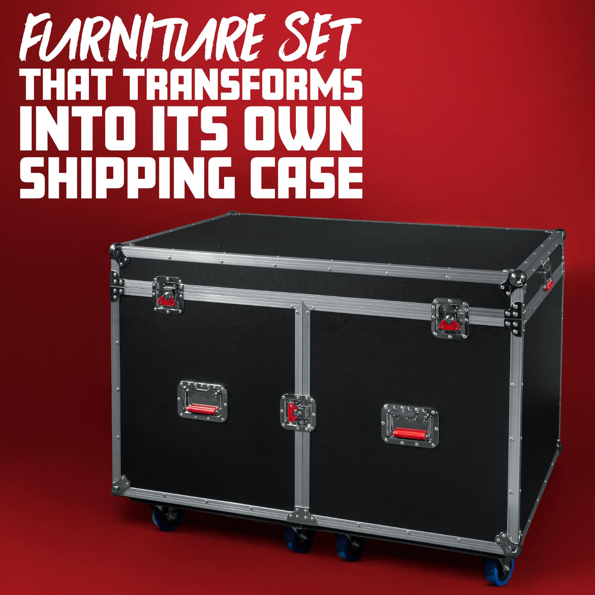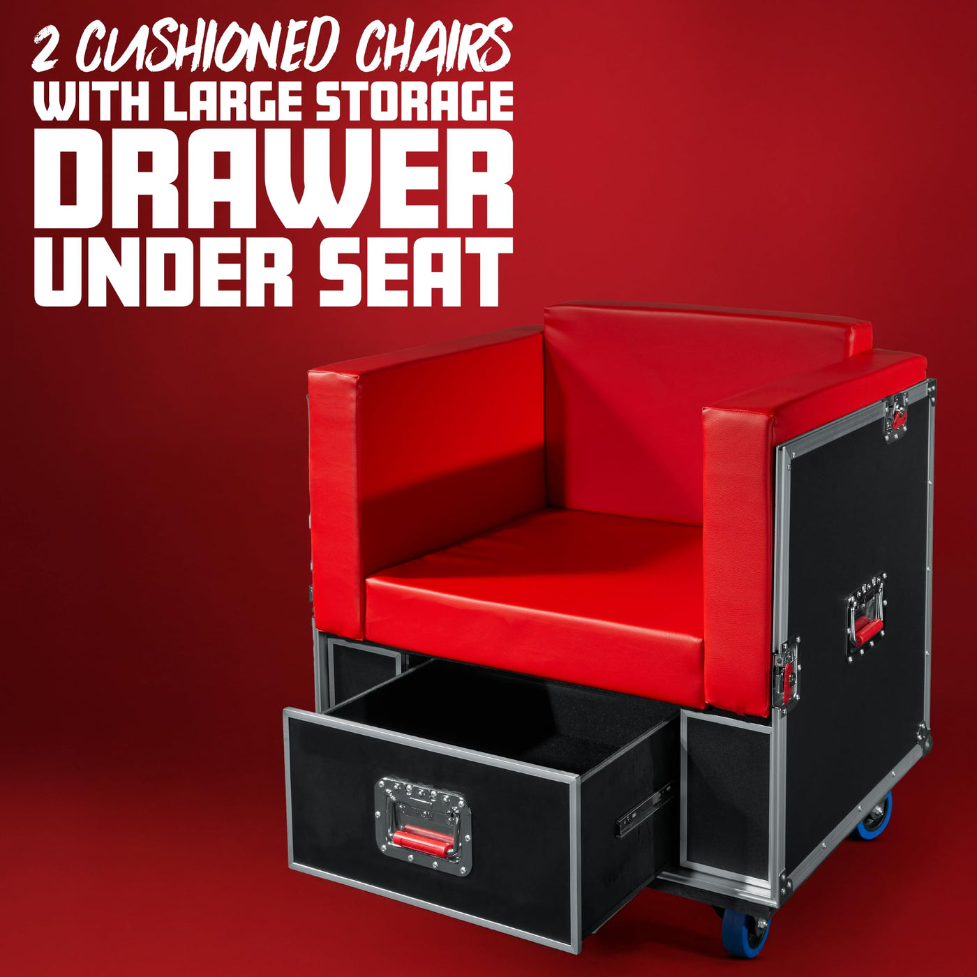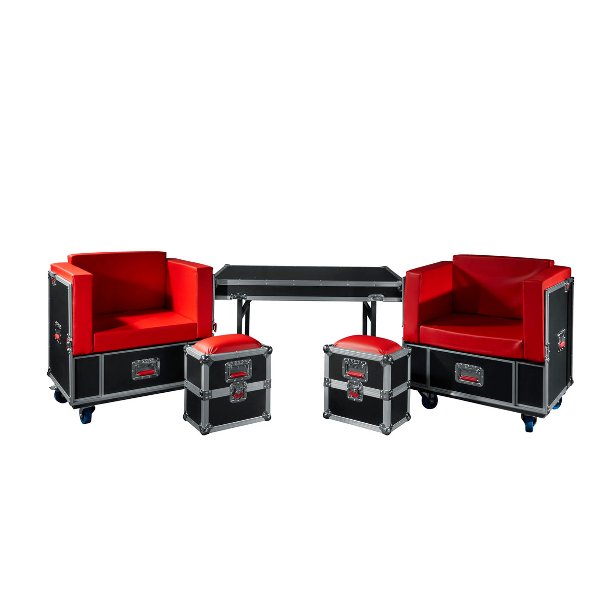Gators G-Tourlounge Offers A Unique, Self-Contained Seating Solution. This Unassuming Plywood Road Case Quickly Transforms Into A Full Furniture Set Including Two Cushioned Chairs, Two Ottomans And A Large Table Top. The Two Chairs Feature Bright Red Overstuffed Cushions With A Large Storage Drawer In The Base. Easily Roll The Chairs Into Position With The Four Casters, Then Lock In Place With The Two Locking Mechanisms. Put Your Feet Up And Get Comfortable With The Two Padded Ottomans That Also Provide Extra Storage Inside. The Lid Of The Case Has Four Sturdy Legs That Unfold To Become A Large Table. With A 48 X 32 Surface Area The Table Provides Plenty Of Room To Spread Out. The Entire Unit Features A Sleek, Black Laminate Coating And Commercial Grade Hardware Including; Gator Signature Red, Spring-Loaded-Rubber Gripped Handles And Red Recessed Twitch Latches. Once The System Is Packed Back Up Incase Form, It Can Be Transported On The Eight Penn-Elcom 4 Heavy-Duty Casters, 4 Of Which Are Locking. The Furniture Set Takes Only Moments To Set-Up Or Tear Down Using The Recommended Two-Person Team.