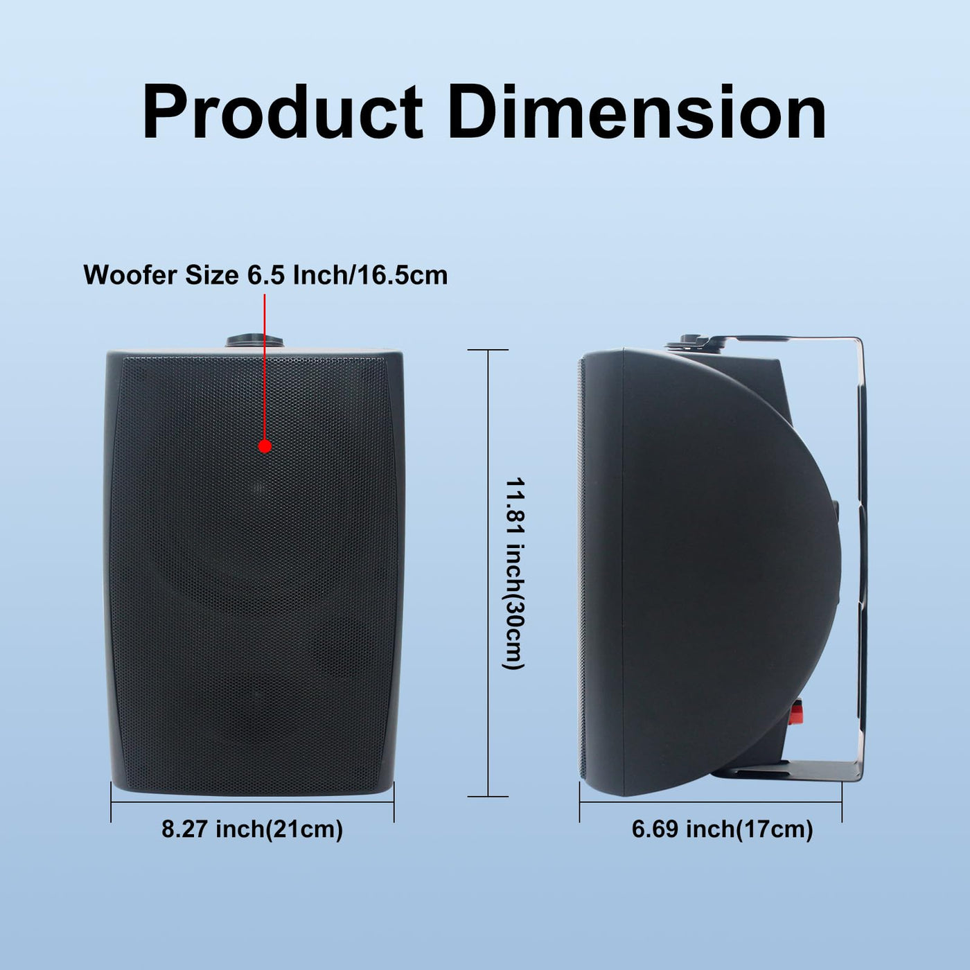 6.5 Inch Indoor/Outdoor Wall Mount Speakers. Passive Wall Mount Waterproof 6.5'' Indoor / Outdoor Speaker System, Black. Features:Includes (2) Speakers (Passive + Passive). Tooled Design For High Power & Deep Bass Response Stain Resistant & Rust Proof Speaker. Grills Gold Plated Binding Post Speaker. Ip66 Waterproof Design Great By The Pool, On The Patio Or In The Boat. For Indoor / Outdoor Use. What'S In The Box: (1) 2X Outdoor Speakers, 2X Speakers Cables(16.4Feet/5M) 1*User'S Manual. Technical Specs: Waterproof Grade Ip66 Rating 6.5'' Long Throw Woofers. Max Power Output: 400 Watt, 6.5' Aluminum Injection Cone Woofer,1'' Pet Dome Tweeter. Cone Material: Pp Mica + Rubber. Surround Frequency Response: 70-20Khz. 6 Ohm Impedance Dimensions: (L X W X H):11.81'' (L) X 8.27'' (W) X6.69''(H).