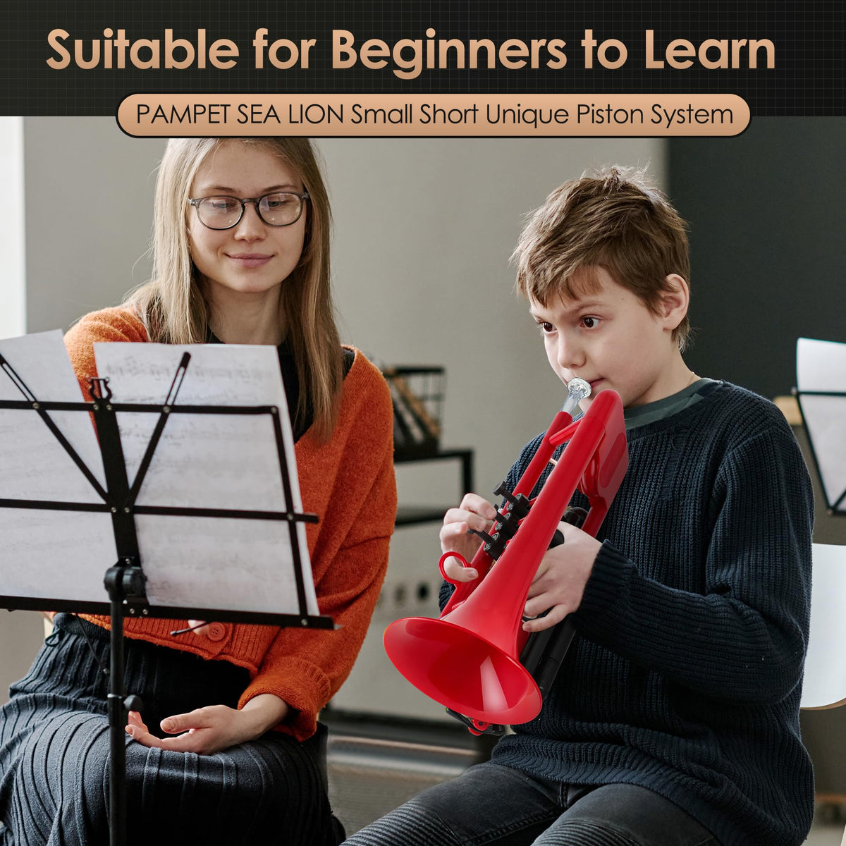 Pampet Sea Lion Professional Plastic Bb Trumpet Standard Trumpets Trumpet Set For Student Beginner Bb Trumpet Instrument (Red)