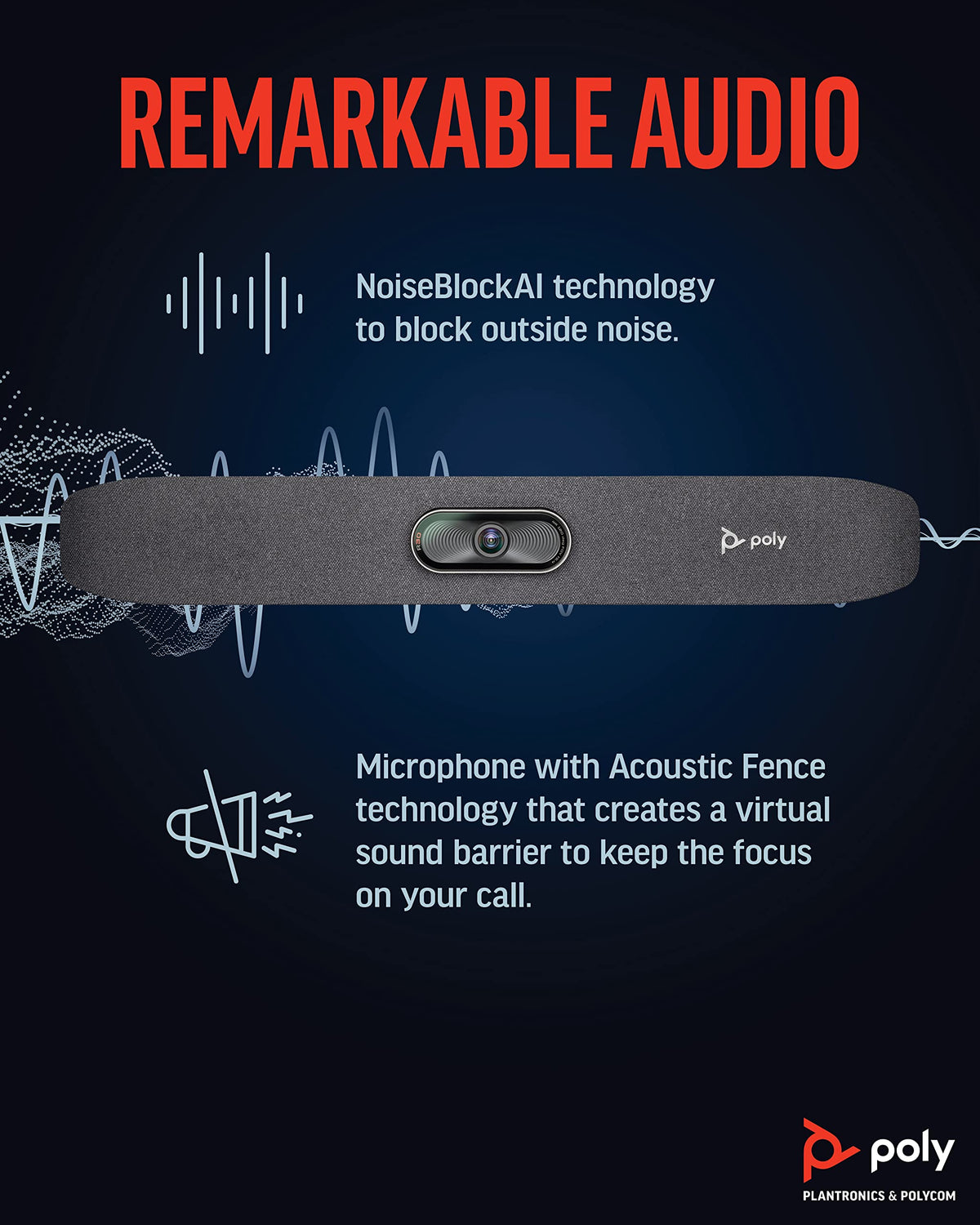 Q: How does the NoiseBlockAI technology work?A: NoiseBlockAI technology in the Poly Studio R30 filters out distracting background noises, ensuring that your voice is heard clearly during meetings, enhancing overall communication quality.