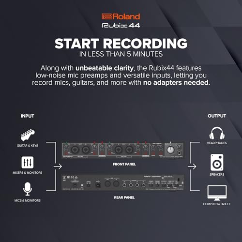Product Descriptionrubix44 Offers A Perfect Balance Of High-Fidelity Sound, Solid Build Quality, Compact Size, Affordable Price, And Crucial Features For Todays Musicians And Producers. With Support For High-Resolution Audio Up To 24-Bit/192Khz, Rubix44 Sounds Clear And Defined And Is Carefully Engineered To Have Extremely Low Noise From Input To Output. Its Near Universal Usb Support Means It Works Seamlessly With Mac And Pc Computers, And Even Supports Ipads, For The Ultimate In Portable Music Production And Performance.From The Manufacturerrolands Rubix44 Offers A Perfect Balance Of High-Fidelity Sound, Solid Build Quality, Compact Size, Affordable Price, And Crucial Features For Todays Musicians And Producers. With Support For High-Resolution Audio Up To 24-Bit/192Khz, Rubix44 Sounds Clear And Defined And Is Carefully Engineered To Have Extremely Low Noise From Input To Output. Its Near Universal Usb Support Means It Works Seamlessly With Mac And Pc Computers, And Even Supports Ipads, For The Ultimate In Portable Music Production And Performance.