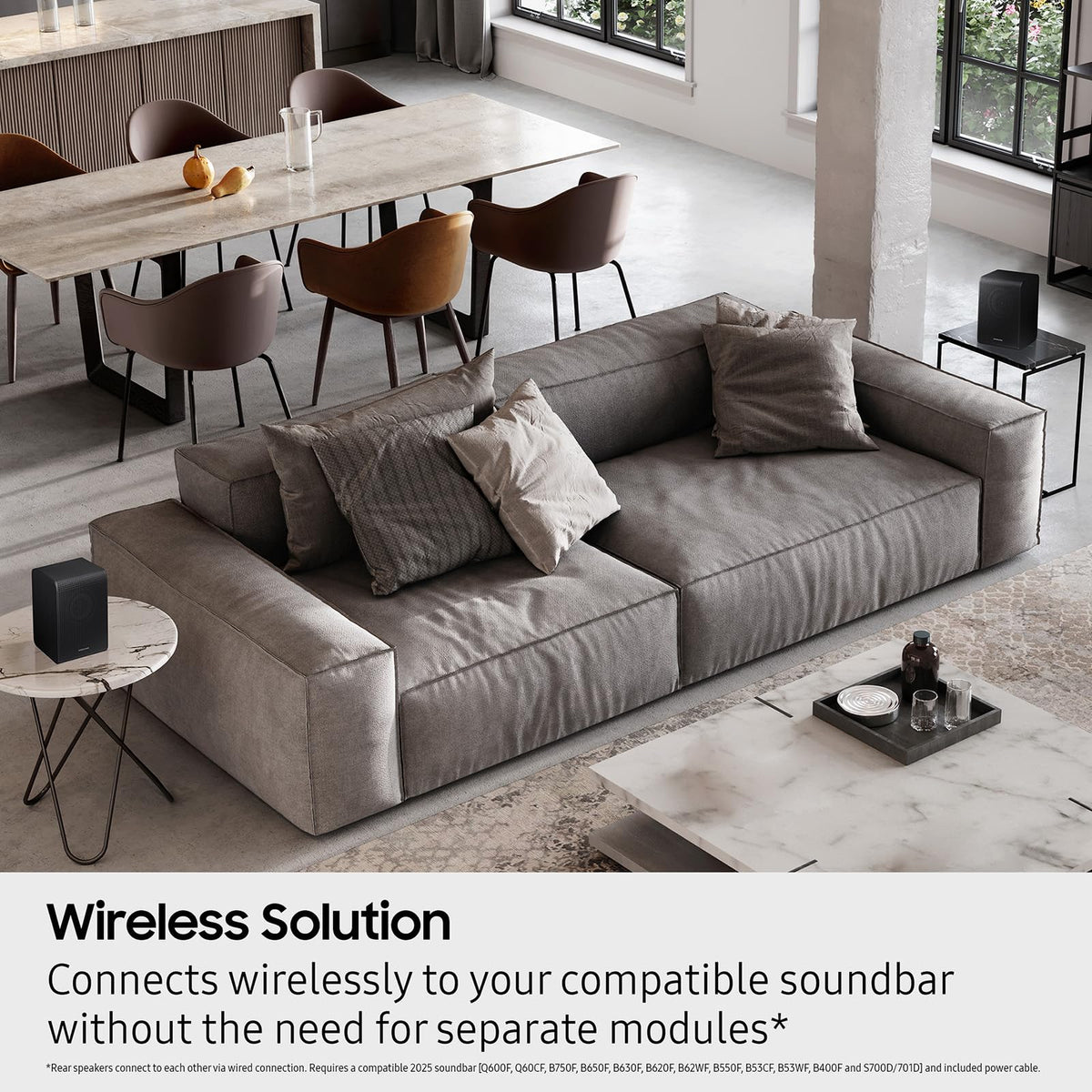 Get A Truly Cinematic Experience From Your Home Theater With Rear Speakers That Connect Wirelessly To Your Soundbar For Simple Setup And Less Clutter. With True Surround Sound, Add Audio Depth And Dimension With Sound That Comes From All Sides, Making You Feel Like Youre In The Scene.**Rear Speakers Connect To Each Other Via Wired Connection. Requires A Compatible 2025 Soundbar [Q600F, Q60Cf, B750F, B650F, B630F, B620F, B62Wf, B550F, B53Cf, B53Wf, B400F And S700D/701D] And Included Power Cable.