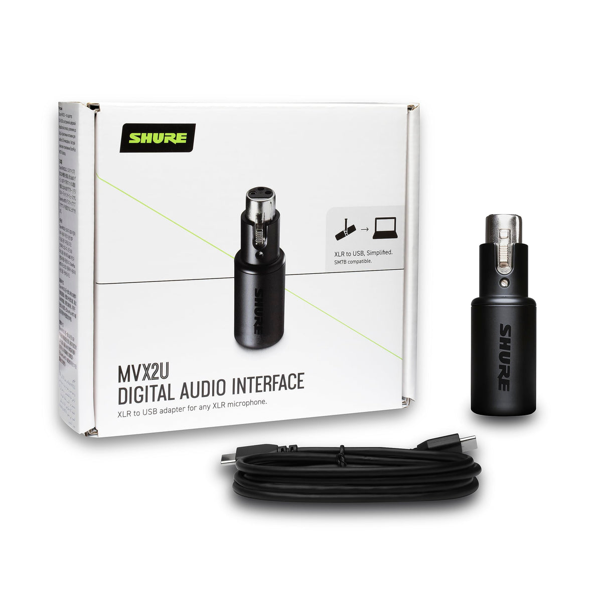 The Mvx2U Digital Audio Interface Is A Powerful, Single-Channel Xlr-To-Usb Adapter That Allows You To Connect Any Xlr Microphone To A Computer For Effortless Recording And Streaming. With Configurable Dsp Features And Full Access To Shureplus Motiv Desktop App, The Compact Interface Is Future-Proofed Via Online Firmware Updates. Providing Up To 60Db Of Clean Gain, The Xlr-To-Usb Adapter Has Enough Power To Bring Your Favorite Dynamic Microphone, Such As The Legendary Sm7B, To Life. It Also Offers Up To 48V Of Phantom Power For Connecting A Condenser Microphone To Your Computer. Portable, Sleek And Rugged, The Mvx2U Can Be Plugged Straight Onto An Xlr Microphone Or Used In-Line With An Xlr Cable, Depending On Your Setup.