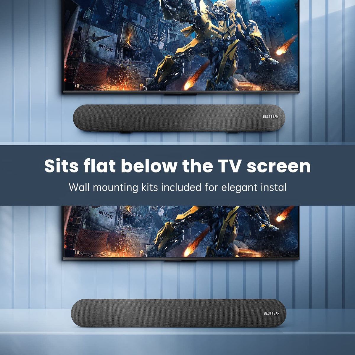 Q: What is the size and design of the BESTISAN soundbar?A: The BESTISAN soundbar has a sleek 28-inch design, making it an aesthetically pleasing addition to your home entertainment setup. Its slim profile helps save space while still delivering powerful sound quality.
