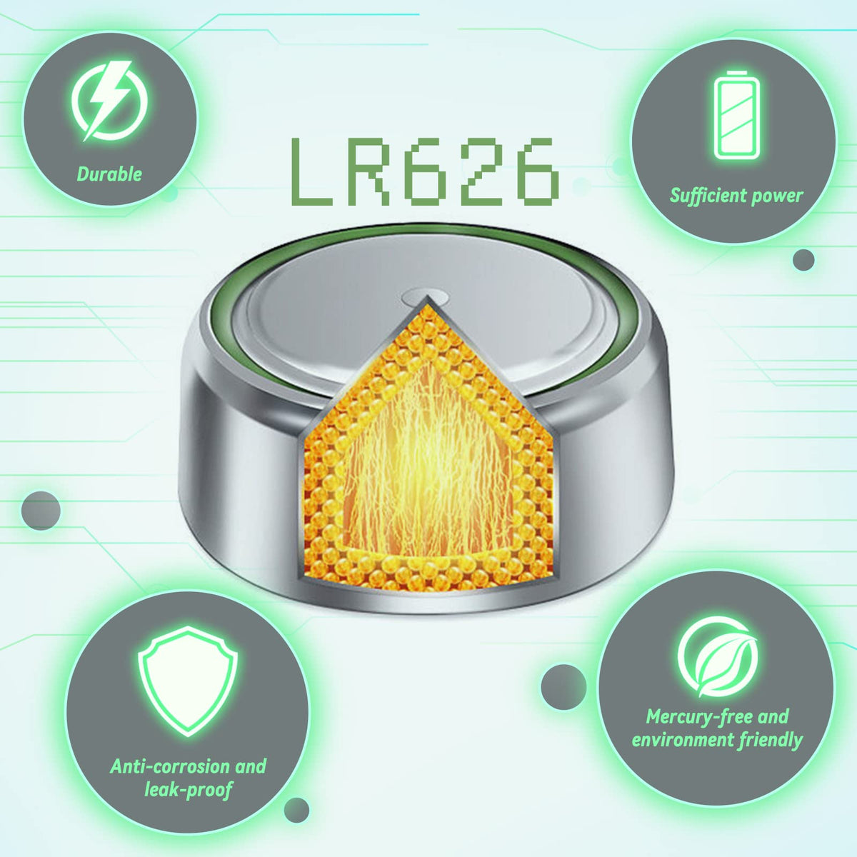Feature: 1. 100% New Brand And High Quality. 2. High Energy Density. 3. Long Lasting. 4. Voltage: 1.5V 5. Chemisty: Alkaline Package: 100 Pcs Lr626 Alkaline Coin Button Cell Battery
