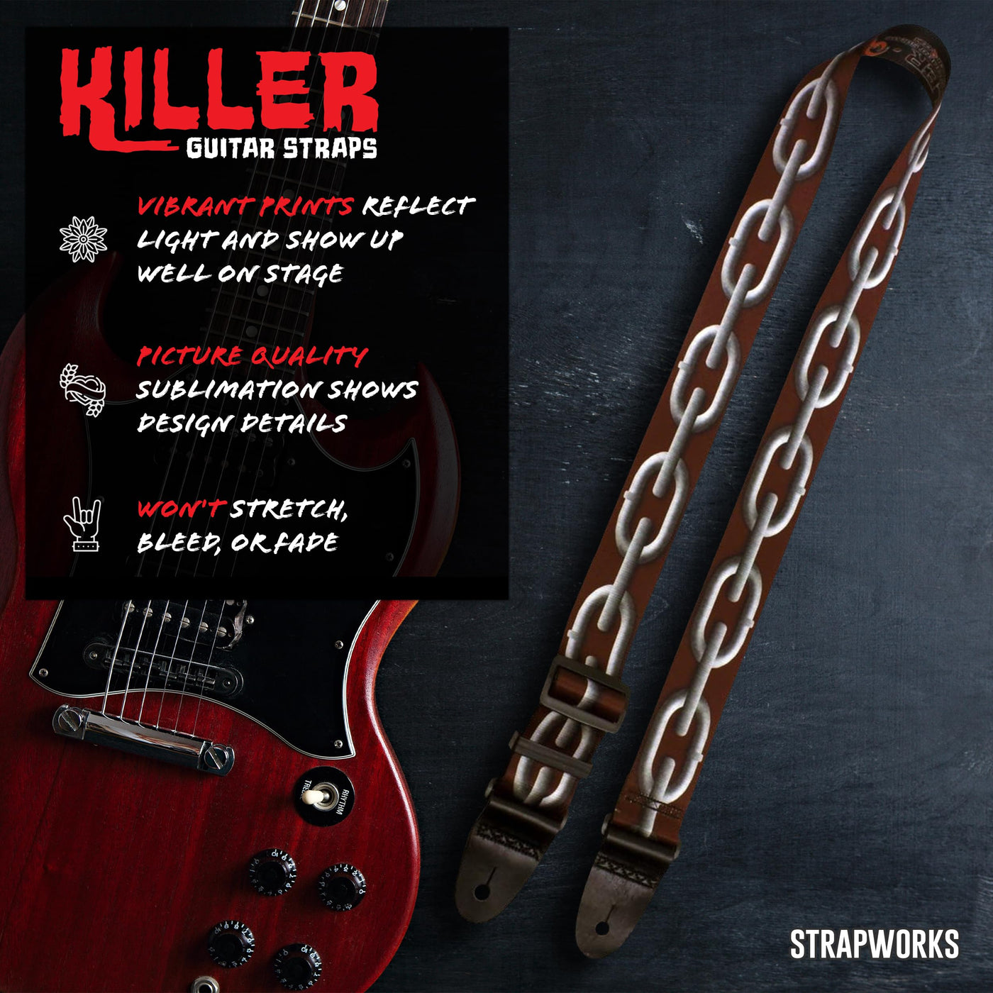 Killer-Q Guitar Strap - Stylish Straps For Electric And Acoustic Guitars With Leather Tabs, 2 Inches X 5 Feet, Chains