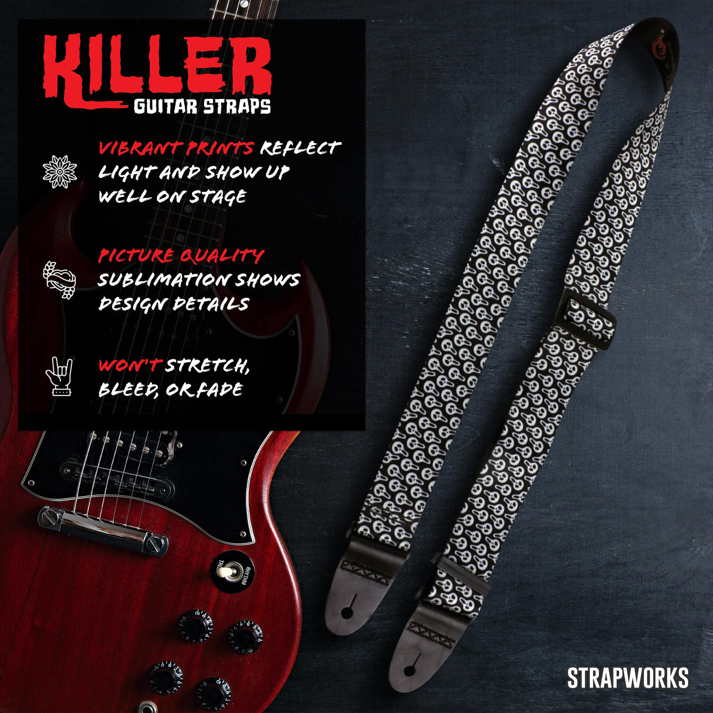 Print Guitar Strap These Fun, Stylish Guitar Straps Are A Favorite Among Electric And Acoustic Guitar Players. They Are Great For Banjos Too! With Many Designs And Colors To Choose From, There Is A Guitar Strap For Every Musicians Taste. Each Guitar Strap Measures 2 Inches Wide (Great For Shoulder Comfort) And 5 Feet Long. The Strap Is Easily Adjustable, So You Wont Have Any Issue Finding The Perfect Length. Superior Design The Guitar Strap Is Made From Picture Quality Polyester That Wont Stretch, Bleed, Or Fade. The Prints Are Sublimated On The Polyester Webbing At Our Facility. The Elegant Genuine Black Leather Ends Are Suitable For Embossing Or Stamping.