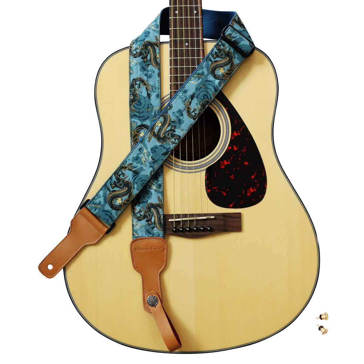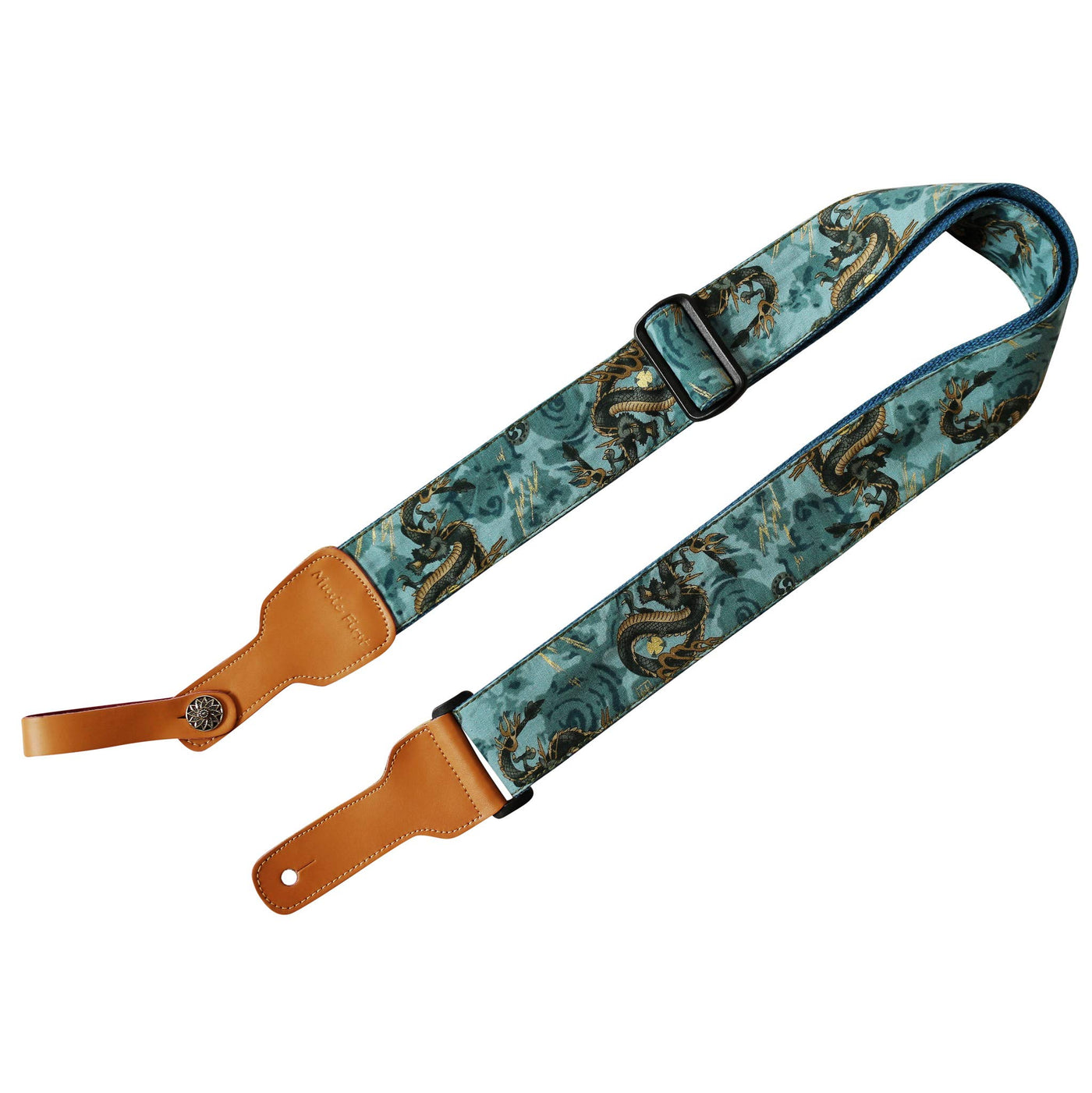 Music First Original Design, 2 Inch Width (5Cm), Ukiyoe Style The Dragon King Soft Cotton & Genuine Leather Delux Guitar Strap, Ukulele Strap, Mandolin Strap / Ukiyoe Style Super Cool Gold Stamping The Dragon King With Pearl Patterned Shell Fabric / Genuine Leather Strap Ends. (Since The Fabric Of The Strap Is Cut From A Big Piece Of Fabric, The Pattern Of Each Strap Will Be A Little Different, That Means Your Strap Will Be Unique!) / Material: Cotton (Out Side) + Genuine Leather+ Cotton (Inner Side)+Abs Accessories (Important! It Will Protect Your Guitar Not Been Scratched) / Width: 2 Inch (5Cm); Length: 62.2Inch ~ 33.6Inch (158Cm~93Cm) Adjustable; Thickness: 0.15Inch (0.38Cm) / One Piece Of Genuine Leather Music First Strap Locker (Worth $7.99) + 2 Golden Color Strap Nails Included. (Notice: The Guitar In The Photos Is Not Included, Thanks! )