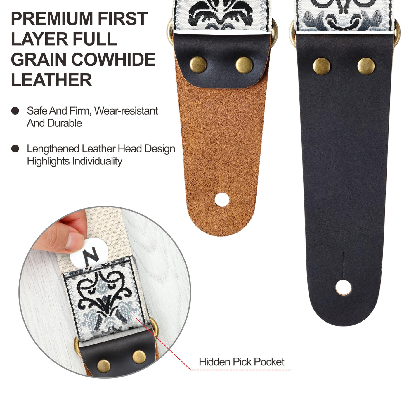 Nefelibata Guitar Strap, Embroidered Cotton Guitar Straps With Head Cowhide Leather Ends For Bass, Electric & Acoustic Guitar, With Strap Button, 1 Pair Of Strap Locks And 4 Guitar Picks