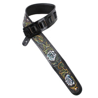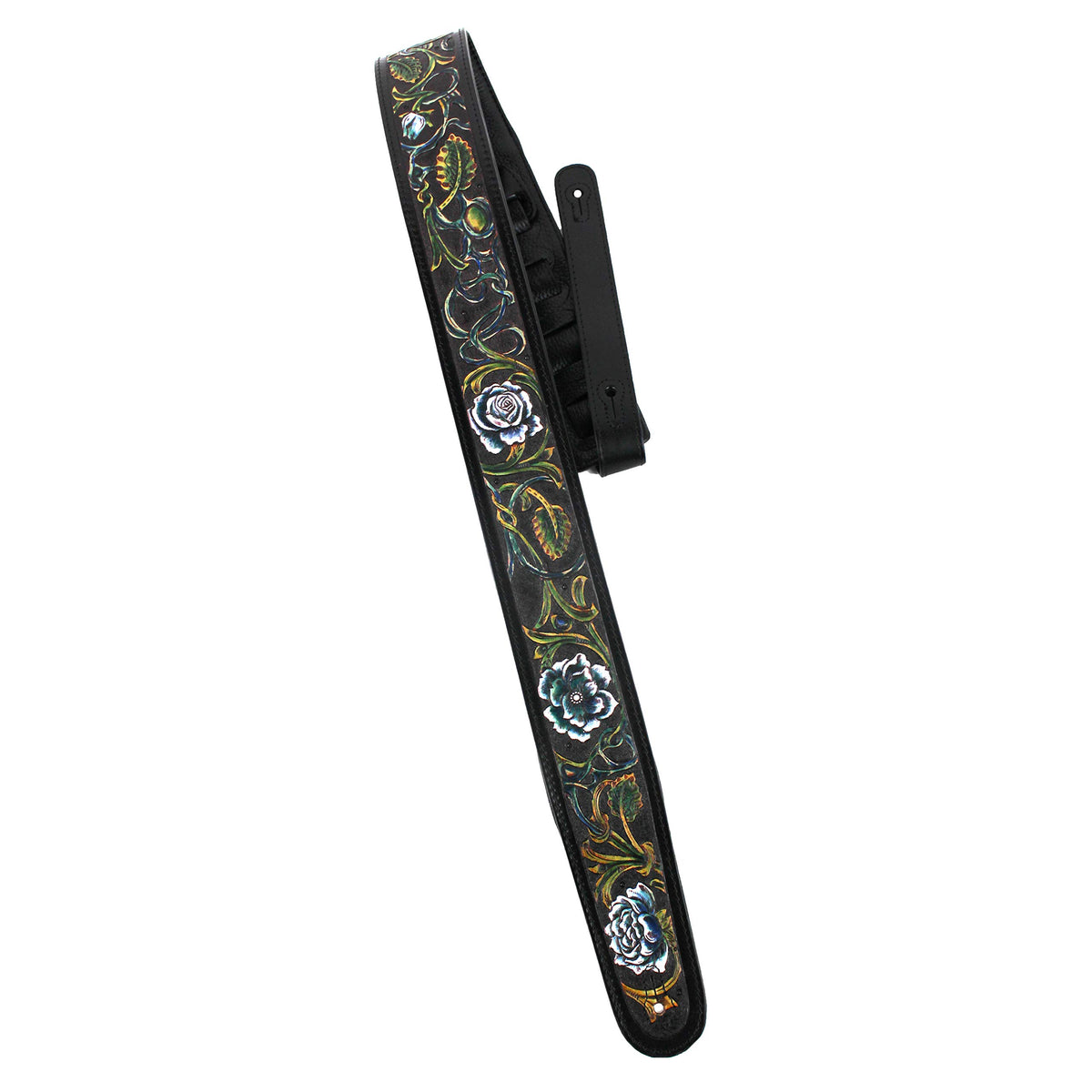 We Have Just Launched The New Lhr Artist Series. Combining Top Grain Carving Leather With Wonderful Leather Craft, We Have Come Up With Modern, Vintage And Brand New Unique Designs. These Straps Have Glossed Black Borders With A Premium Full Length Piece Of Carved Leather. We Have Added A Premium Leather Padded Back For Long Time Comfort. With Colors Ranging From Gloss Black, Subtle Brown'S To Vibrant Blue'S These Straps Are Sure To Go Well With A Large Variety Of Guitar Finishes And ''Pop'' On Or Off Stage.Lhr-13 Black Premium Leather Strap W/ Prussian Blue And White Floral Carvingsuper Comfortable Premium Padded Glove Leather Backtop Grain Semi Gloss Blackfull Length Carved Leather Topmellow Blue And White Floral Vine Designblack Top Stitchingblack Borders2.50'' Wideadjustable From 39''-56''