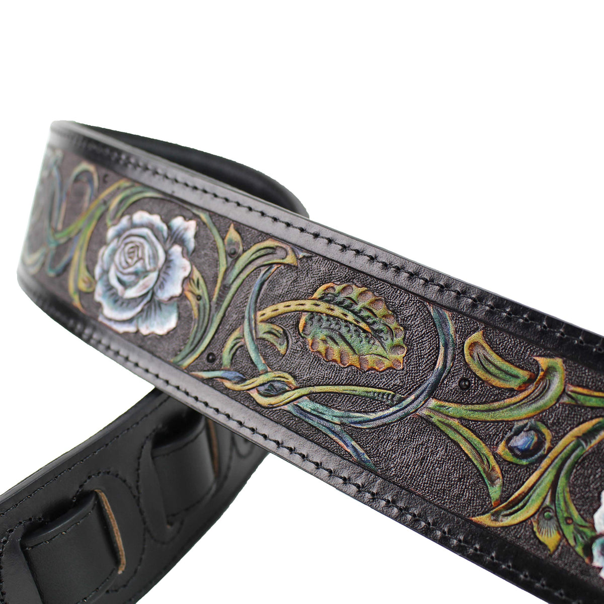 Walker And Williams Lhr 13 Handmade Black Premium Carved Leather Guitar Strap With Prussian Blue And White Western Floral Carvin
