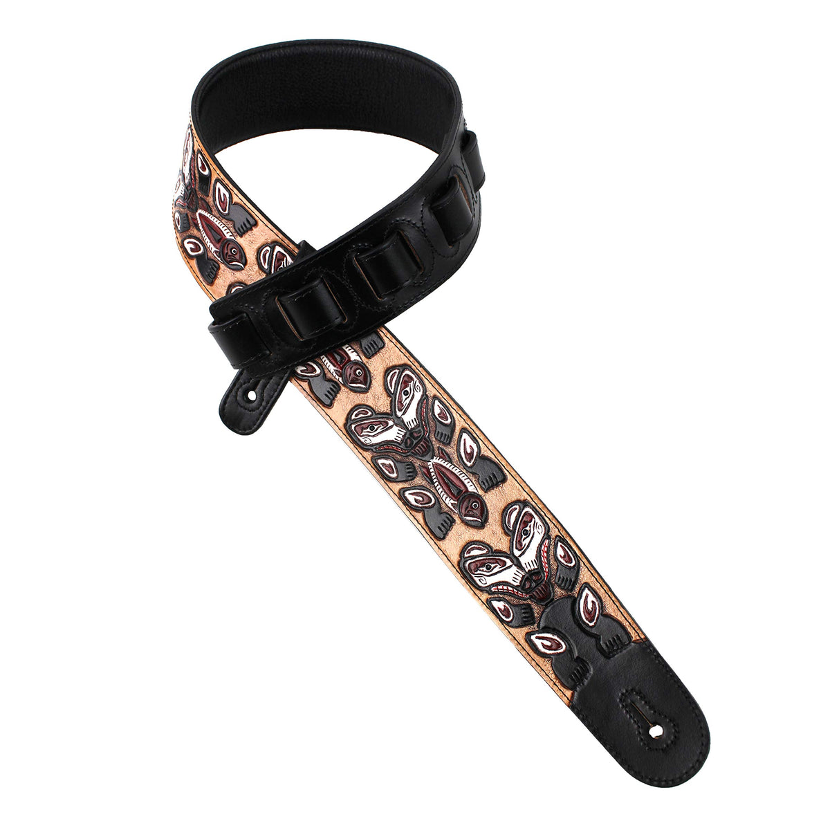 We Have Just Launched The New Lhr Artist Series. Combining Top Grain Carving Leather With Wonderful Leather Craft, We Have Come Up With Modern, Vintage And Brand New Unique Designs. These Straps Have Glossed Black Borders With A Premium Full Length Piece Of Carved Leather. We Have Added A Premium Leather Padded Back For Long Time Comfort. With Colors Ranging From Gloss Black, Subtle Brown'S To Vibrant Blue'S These Straps Are Sure To Go Well With A Large Variety Of Guitar Finishes And ''Pop'' On Or Off Stage.Lhr-23 Gloss Black Premium Leather W/ North West Bear Totem Carvingsuper Comfortable Premium Padded Glove Leather Backtop Grain Semi Gloss Black Endsfull Length Carved Leather Topnorth Western Bear And Salmon Totem Designblack Top Stitchingnatural Tan Backgroundblack Borders2.50'' Wideadjustable From 39''-56''