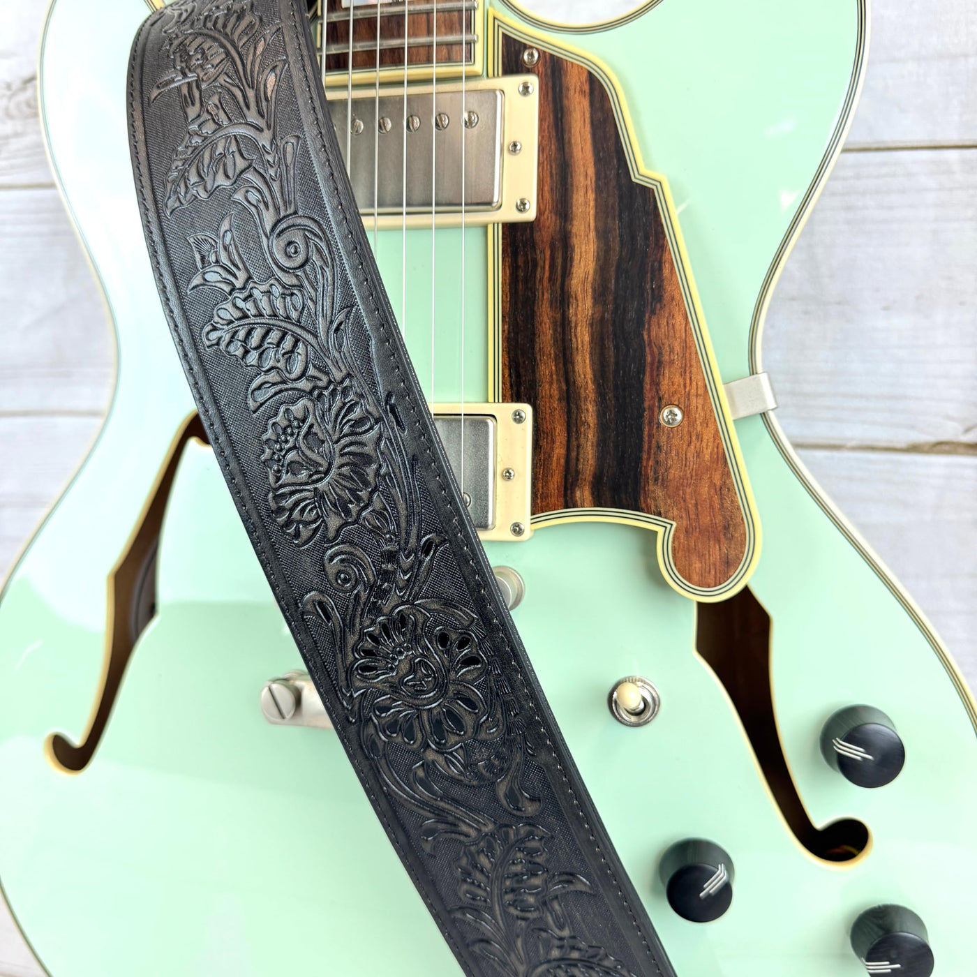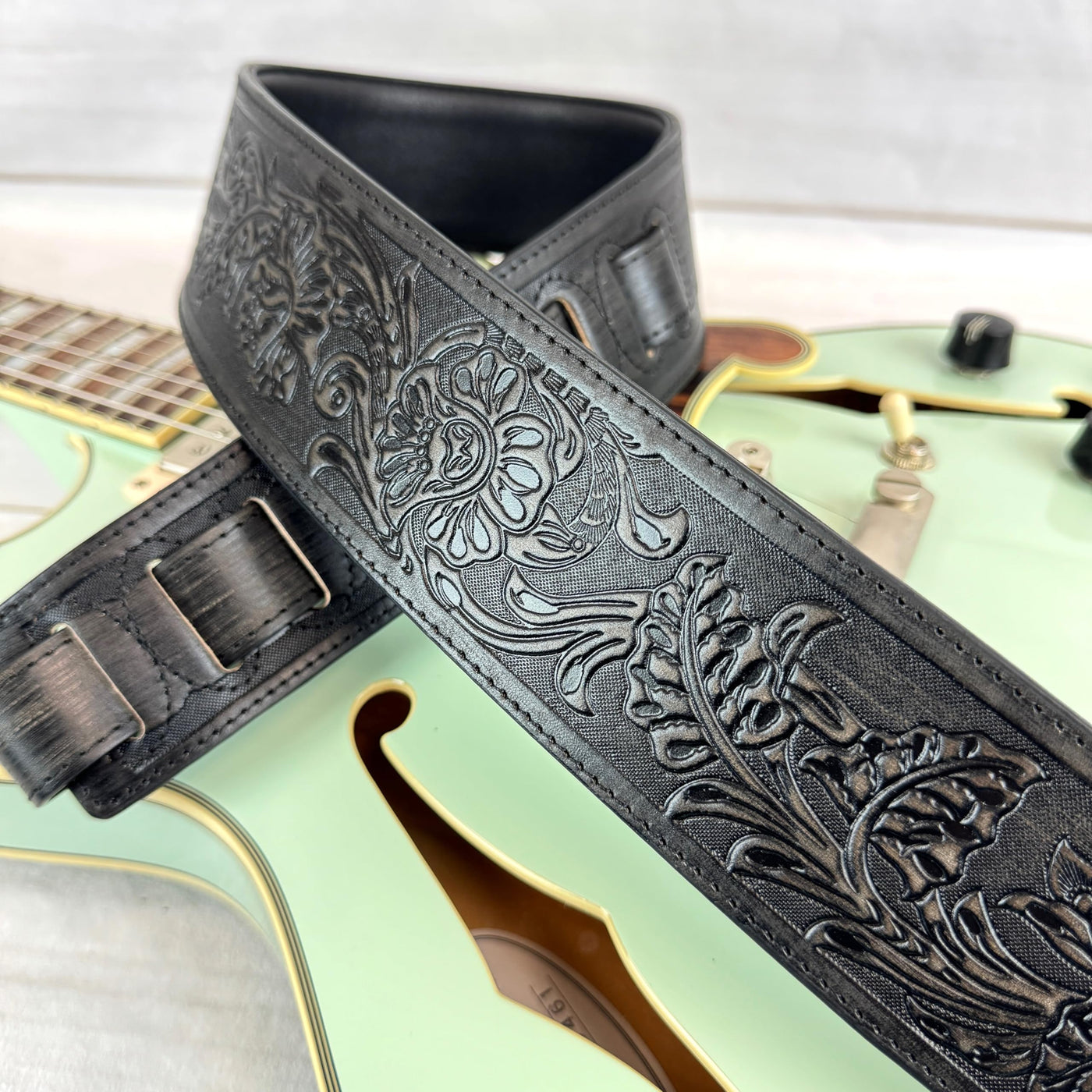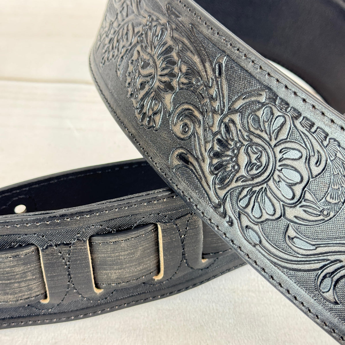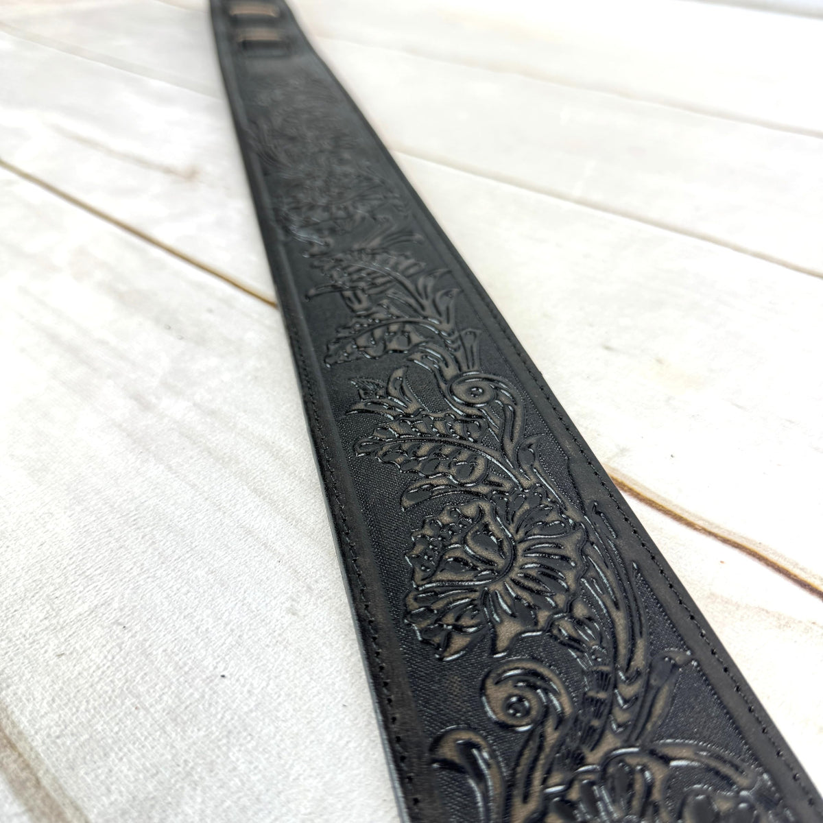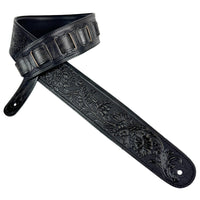 Walker & Williams Lif 02 Distressed Black Handmade Leather Padded Guitar Strap With Western Sheridan Tooling For Acoustic, Elect