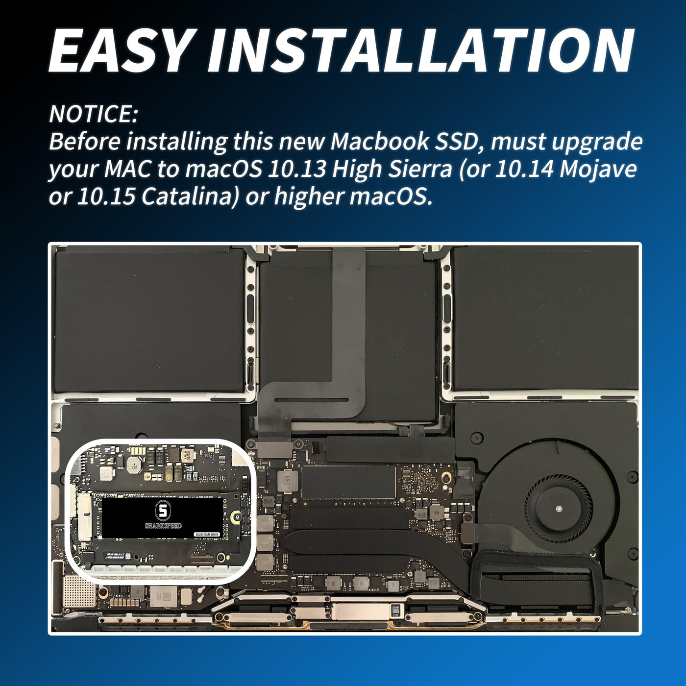 High Performance This M.2 Nvme Ssd For Macbook From S Sharkspeed Uses The 3D Nand Technology And A New Generation Of Intelligent Chips, Thus Achieving Ultra-High Speed Reading. It Provides A Larger Capacity And Better Performance, Reliability, Stability, Compatibility, And Durability To Meet Various Needs Such As Gaming And Workplace Use. High Speed Transmission The Macbook Replacement Ssd Adopts M.2 Nvme Pcie Gen 3.0 Technology, With A Read Speed Of Up To 2500Mb/S And A Write Speed Of Up To 2000Mb/S, Which Is 5 Times The Speed Of Sata Ssd. It Can Quickly Transfer Various Large Files Such As Images And Videos. Note: Transfer Speed Varies By Drive Capacity, System, Testbed Hardware, And Application. Important Note Before Installing This New Macbook Ssd, Must Upgrade Your Mac To Macos 10.13 High Sierra (Or 10.14 Mojave Or 10.15 Catalina) Or Later Macos. These Os Versions Include An Efi Firmware Updates For Mac. Without The Update, The New Ssd Will Not Be Recognized.