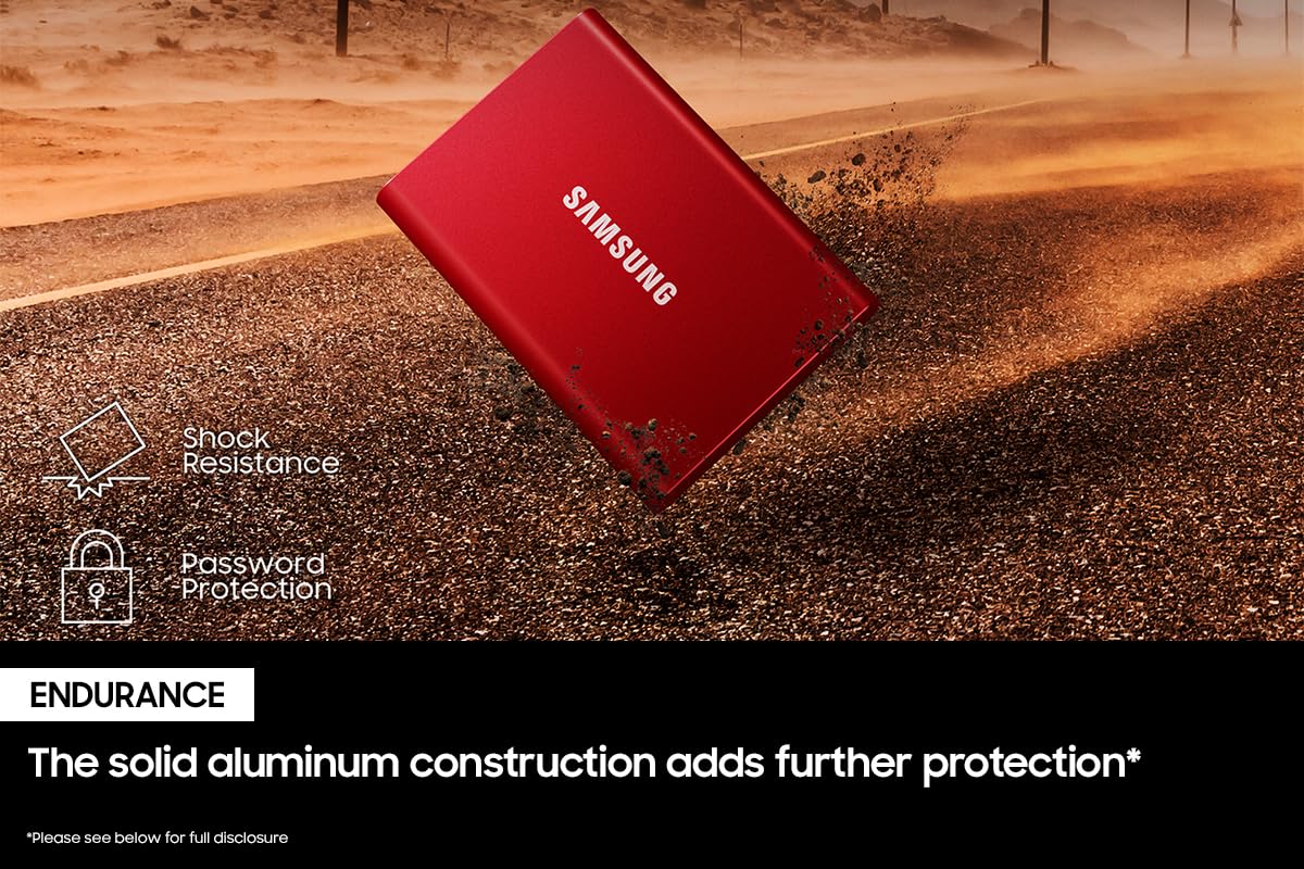 Q: Is the SAMSUNG T7 Portable SSD durable and shock-resistant?A: Yes, the SAMSUNG T7 Portable SSD is designed with a shock-resistant aluminum unibody construction and can withstand drops from up to 6 feet. This durability makes it an excellent choice for on-the-go use.