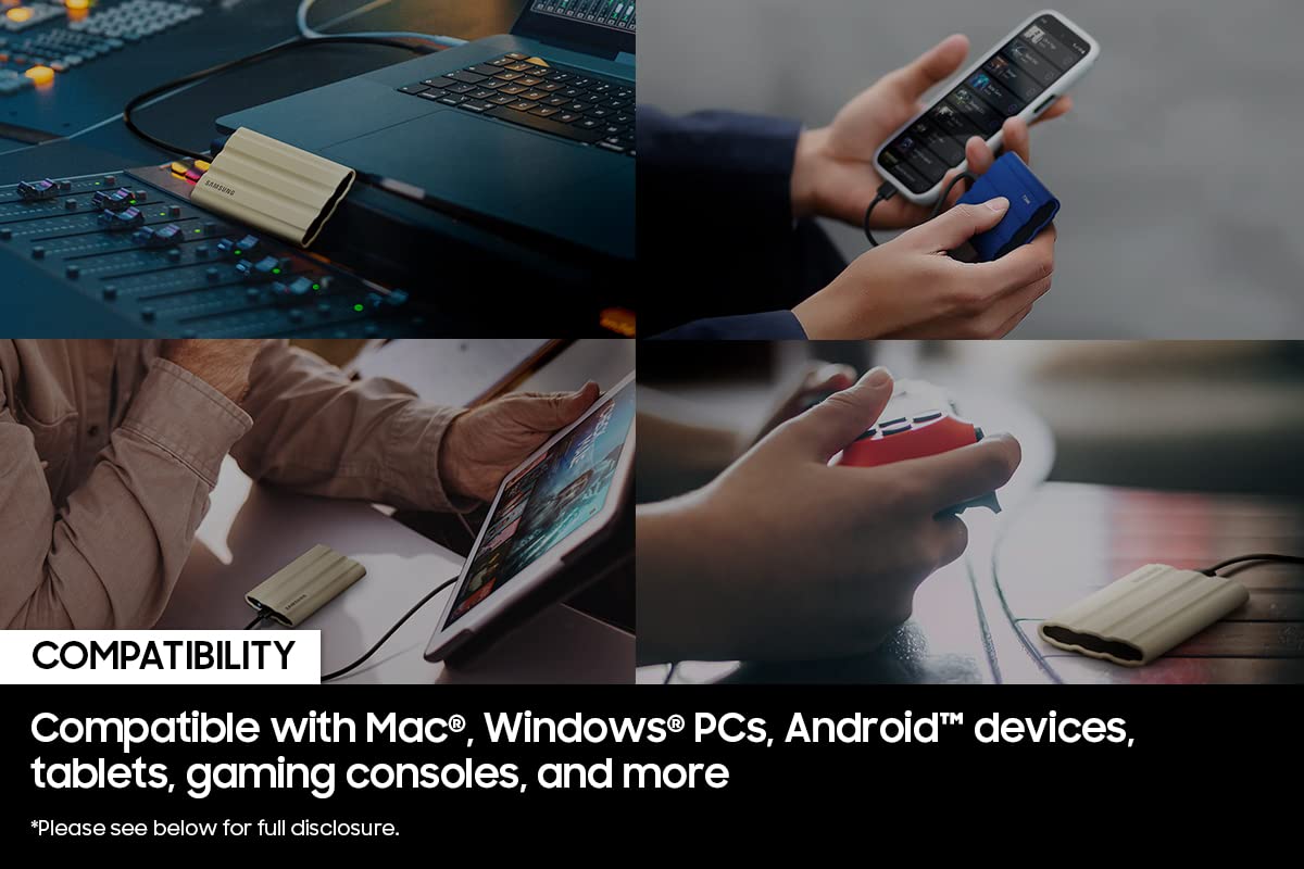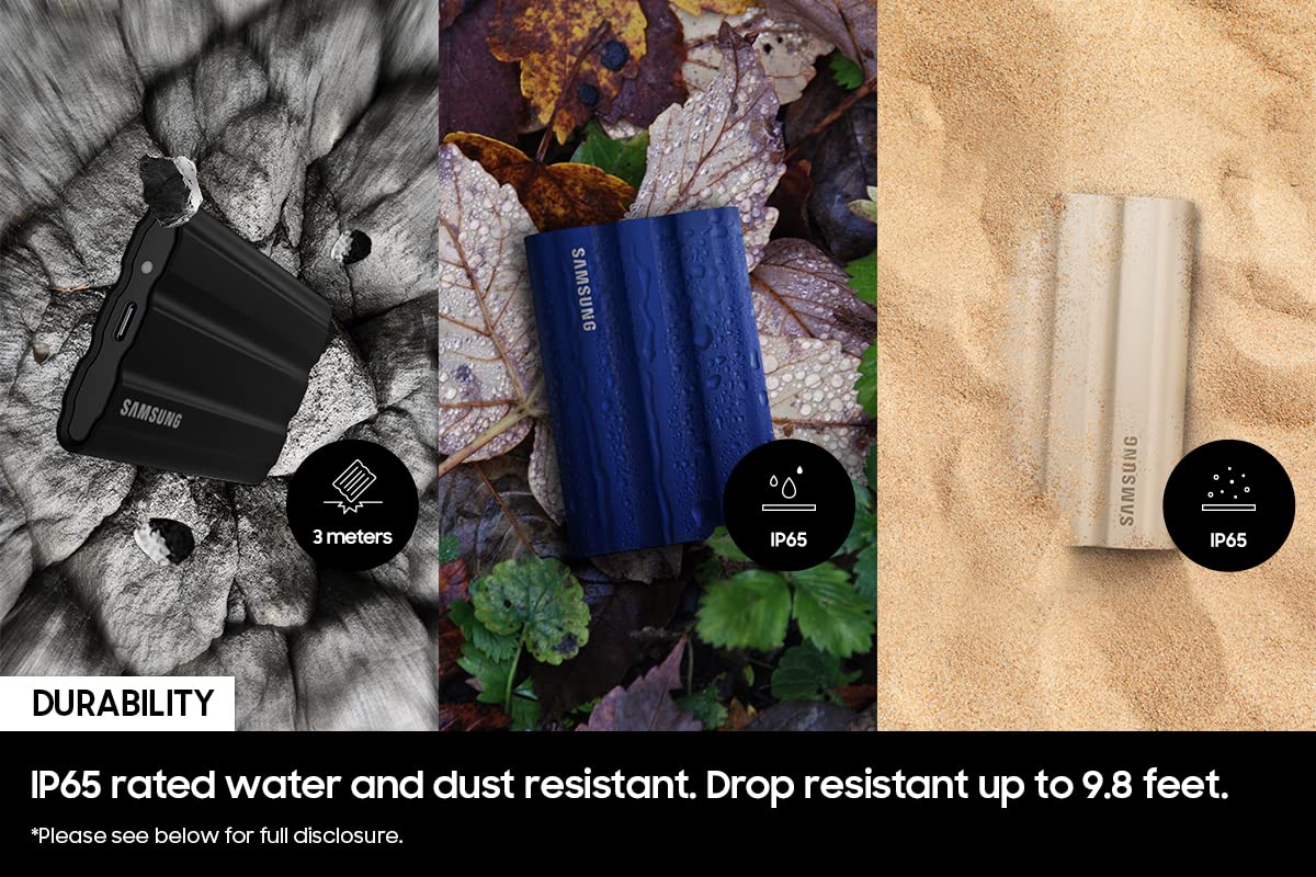 Samsung T7 Shield Portable Ssd Delivers High Performance On-The-Go, Not Matter The Terrain. It Has An Ip65 Rating For Water1 And Dust2 Resistance, With Dynamic Thermal Guard To Manage Heat Control. Transfer Huge Files Instantly. Usb 3.2 Gen 2 And Pcie Nvme Achieve Soaring Sequential Read/Write Speeds Of Up To 1,050/1,000 Mb/S4, Allowing You To Edit Directly From The Drive. The Rugged Design And Advanced Outer Elastomer Add Extra Durability To Even Endure A 9.8 Foot Drop3. The T7 Shield Is Compatible With Pc, Mac, Android Devices, Gaming Consoles, And More.1Consistent With Ip65 Rating, Tested Under Controlled Conditions: Water Flow Of 100Kpa For 3 Minutes. Water Resistant Capabilities May Vary Depending On The Actual Conditions.2Consistent With Ip65 Rating, Tested Under Controlled Conditions: 2Kg/M Of Active Dust With A Pressure Under 2Kpa For 8 Hours. Dust Resistant Capabilities May Vary Depending On The Actual Conditions.3Tested To Withstand 9.8-Ft (3 Meters) Drop Under Controlled Conditions. Drop Resistance Capability May Vary Depending On The Actual Environmental Conditions.4Performance May Vary Depending On Host Configuration. To Reach Maximum Read/Write Speeds Of Up To 1,050/1,000 Mb/S, Respectively, The Host Device And Connection Cables Must Support Usb 3.2 Gen 2 And The Uasp Mode Must Be Enabled.5Tested To Withstand 9.8-Ft (3 Meters) Drop Under Controlled Conditions. Drop Resistance Capability May Vary Depending On The Actual Environmental Conditions.6Source: 2003-2022 Omdia Data: Nand Suppliers Revenue Market Share.7Included Ssd Cable Recommended.