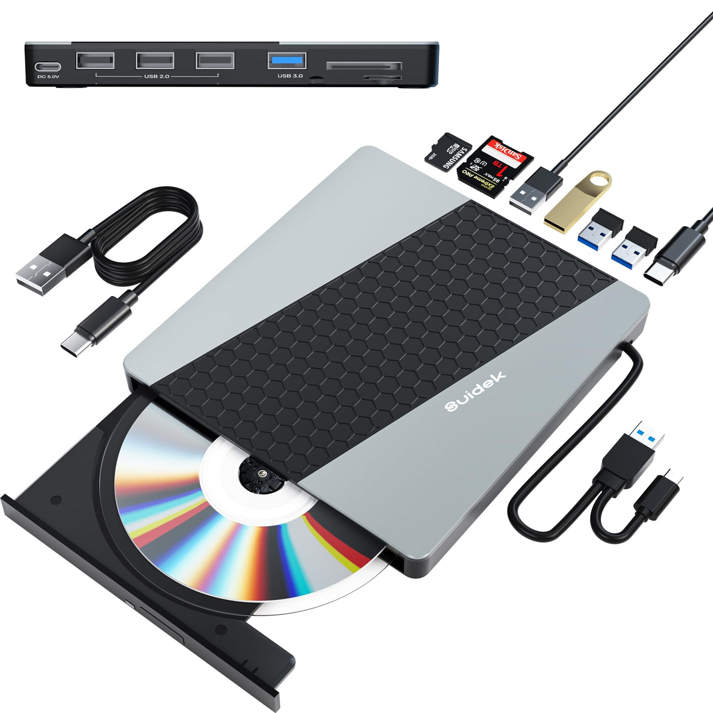 Suidek External Cd Dvd Drive, Usb 3.0 Usb C Portable Cd Dvd +/ Rw Burner Dvd Player For Laptop With Sd/Micro Sd Card Reader 8 In