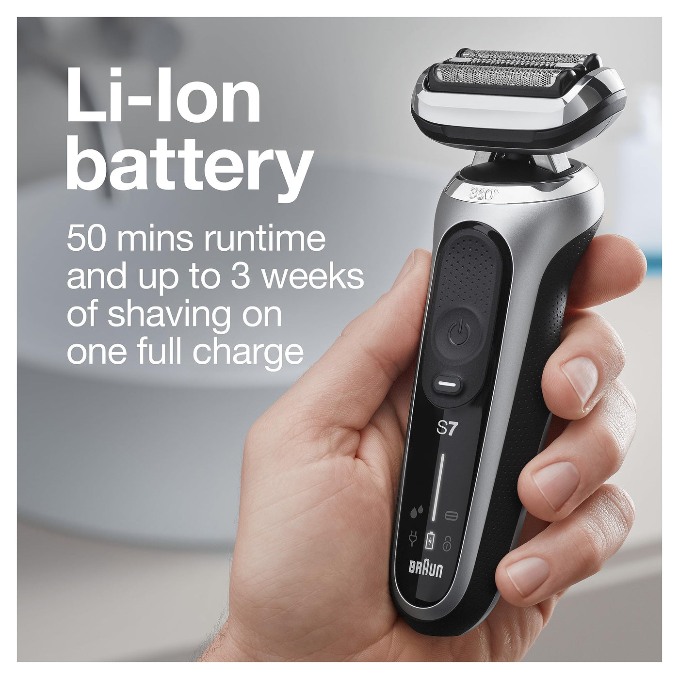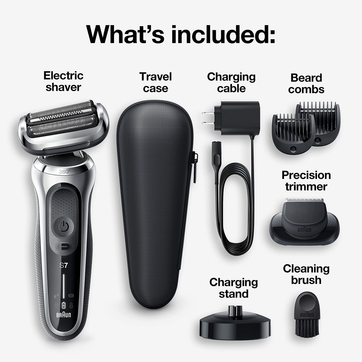 Braun Series 7 Flex Electric Shaver For Men With 360 Degree Adaptation For A Smooth Shave. Features Autosense Technology That Reads And Adapts To Your Beard Density, Removing More Hairs In Every Stroke. The Li-Ion Battery Provides Up To 3 Weeks Of Shaving And A 5 Min Quick Charge. This Mens Electric Razor Is 100% Waterproof For Wet & Dry Use. Compatible With Easyclick System. Beard Trimmer Attachment Included. Box Includes 1X Series 7 Electric Razor For Men - Silver 1X Beard Trimmer Attachment 1X Charging Stand 1X Travel Case 1X Smart Plug For Automatic 100-240 Voltage Adjustment 1X Cleaning Brush