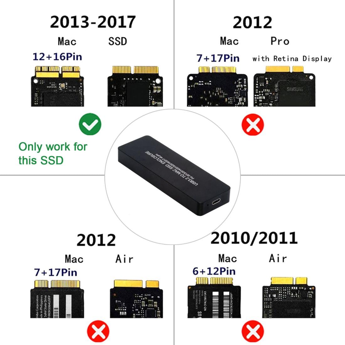 1) The Ssd Is Not Included, Ssd Must Be 16+12Pin Contacts.(See The Photo,Otherwise Not Work),Please Check Your Ssd, It Will Dont Work If It Upto 3.1A Or Later. 2) Support Mac Air Pro Retina 2013/2014/2015/2016 Air, Pro. 3) Jms586A Chipset: Jms586A Is Usb3.2 Gen 2X2 To Pcie Nvme/Ahci Gen3 Bridge Controller. The Upstream Port Supports Usb 20Gbps Connectivity. 4) Interface: Type-C Usb 3.0 Support Current: 3A (Max.) ,The Product Has Type-C Usb 3.0 Interface, Supporting Plug & Play And Hot-Swapping. 5) Package Includes: 1 X Usb-C To Mac Ssd Enclosure, 1 X Usb C To Usb 3.0 Cable ,1 X Usb C To C Cable , 1 X Screwdriver. Compatibility With: 2013 Mac Pro A1493 A1502 ( Md864 Md865 Md293 Md294) Ssd. 2013 Mac Pro Retina A1398 A1502 (Me864 Me865 Me866 Me293 Me294) Ssd. 2013 Mac Air A1465 A1466 ( Md711 Md712 Md760 Md761) Ssd. 2014 Mac Air A1465 A1466 ( Md711 Md712 Md760 Md761) Ssd. 2014 Mac Pro Retina A1502 A1398 (Mgx72 Mgx82 Mgx92 Mgxa2 Mgxc2) Ssd. 2015 Mac Pro Retina A1502 A1398(Mf839 Mf840 Mf841 Mgxa2 Mgxc2) Ssd. 2015 Mac Air A1465 A1466(Mjvm2 Mjvp2 Mjve2 Mjvg2) And Mac Pro Me253 Md878 Ssd.