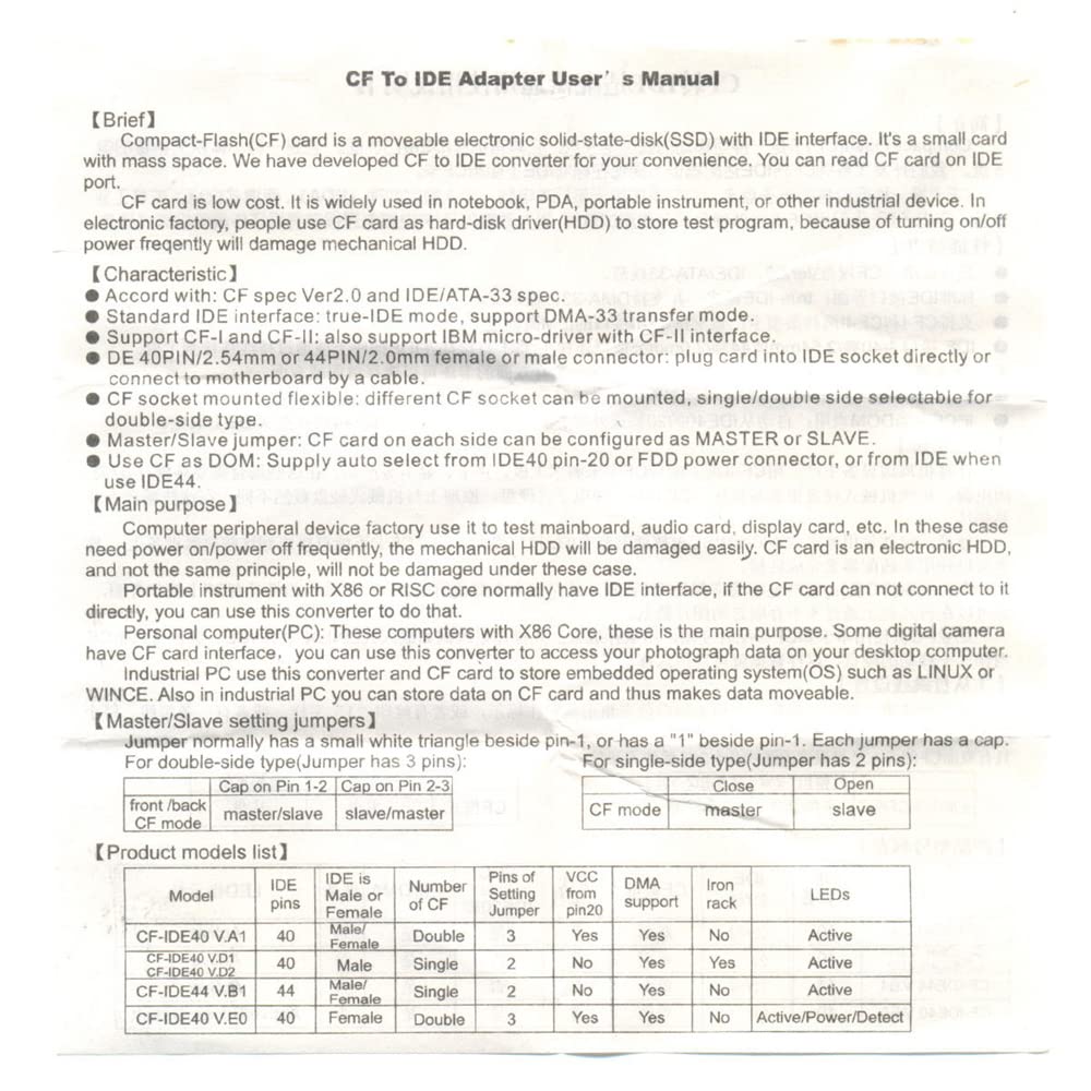 With This Adapter, You Would Replace Hdd With Cf Card As Ssd. Excellent For Laptop With Ide Slot And Mini-Itx | Type I, Ii & Microdrive Compact Flash Supported Jumper Selectable For Master/Slave | Support All Fixed Disc Mode Cf Card In The Market Operate In True Ide Mode And Support Udma Mode, Bootable On Any Operating System, E.G. Linux, Dos And Windows | Attention!!!Udma Requires Support From Your Notebook Bios And Also The Cf Card | Special Male Ide Connector, Check Carefully The Side Of The Ide Connector Before Purchase.