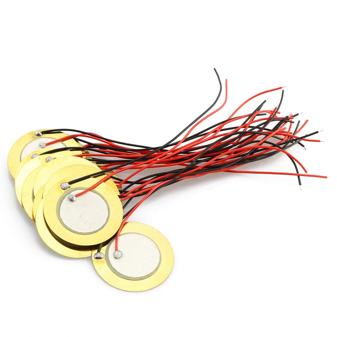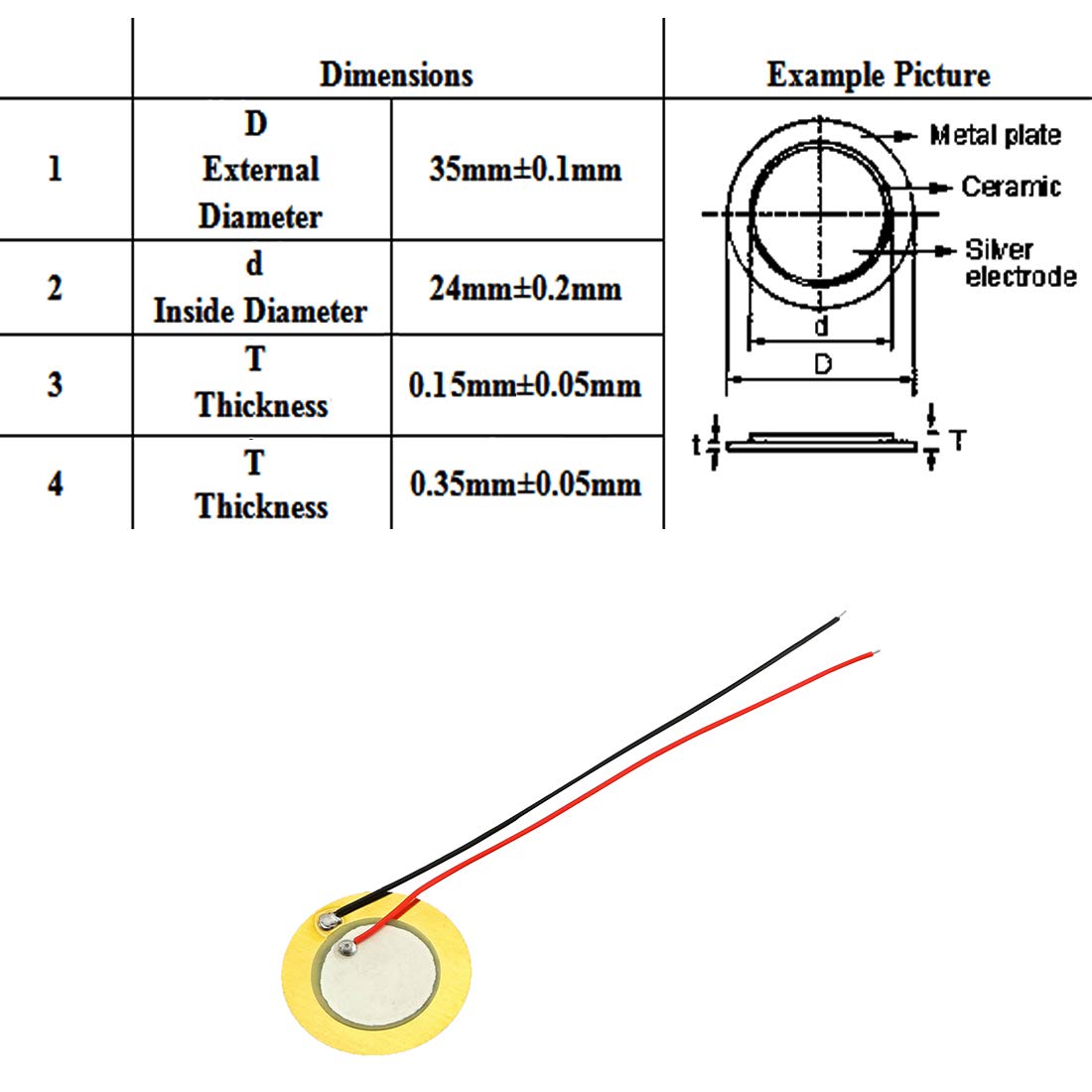 Specification Plate Material: Brass. Resonant Frequency: 1.8 +/- 0.3 Khz. Resonant Impedance: Less Than Or Equal To 300 Ohms. Static Capacitance: 50000Pf +/- 30%. Storage Temop:-30 Degree Celsius-+70 Degree Celsius. External Diameter: 35Mm / 1.38 Inch. Inside Diameter: 24Mm / 0.94 Inch. Lead Length: 10Cm /3.94 Inch. Package Contents: 15 Pcs. Suitable For Diy Projects, Contact Microphones, Cigar Box Guitar Pickups, Touch Sensors, Drum Triggers, Homemade Speakers, Buzzers, Etc.