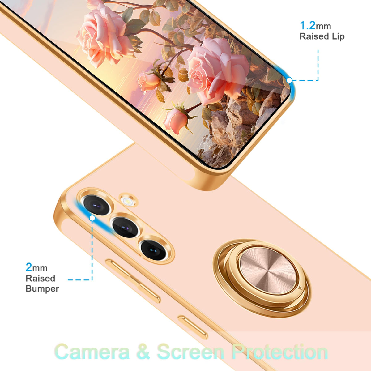 Fingic Samsung Galaxy S24 Pink Case With 360 Rotatable Ring Holder Magnetic Kickstand Slim Soft Tpu Rugged Bumper Shockproof Protective Cover Case For Samsung Galaxy S24 For Women Girls Specifications: Compatible Model:For Samsung Galaxy S24,6.2 Inch(5G,2024 New Released) 2. Color:Rose Gold/Gold Package Includes: 1X Cell Phone Case For Samsung Galaxy S24 Key Features: 1.Fingic Hybrid Pink Samsung Galaxy S24 Case Provides Shock Absorption And Scratch Prevention While Maintaining A Slim Profile. 2.Built-In A Ring Kickstand, Which Can Rotate 360 Horizontally And 180 Vertically. 3.Metal Plate On The Ring Back Can Attach To Magnetic Car Mount For Navigation When Driving. 4. This S24 Case Made With Soft Tpu Material, With Glitter Gold Plated Edges,Sleek,Has A Beautiful Appearance And Comfortable Hands Feeling. 5.Interior A Soft Felt Lining Further Protects The Screen From Scratches Or Abrasions. 6.Raised Lip Protects The Front Screen And The Back Camera Lens From Shockproof And Drop Protection. 7.Precise Cutouts Make All Buttons, Speakers And Charging Ports Easily Accessible. Questions & Answers: 1.Does This Samsung Galaxy S24 Phone Case Compatible With Wireless Charging? Not Compatible With Wireless Charging Becuase Of The Ring Holder. 2.Does This Samsung Galaxy S24 5G Case Have A Built In Screen Protector ? Not Including A Screen Protector,But It Is Friendly To A Screen Protector. 3.Does This Case Fit For Samsung Galaxy S24 Plus+/S24 Ultra ? Not Fit For.