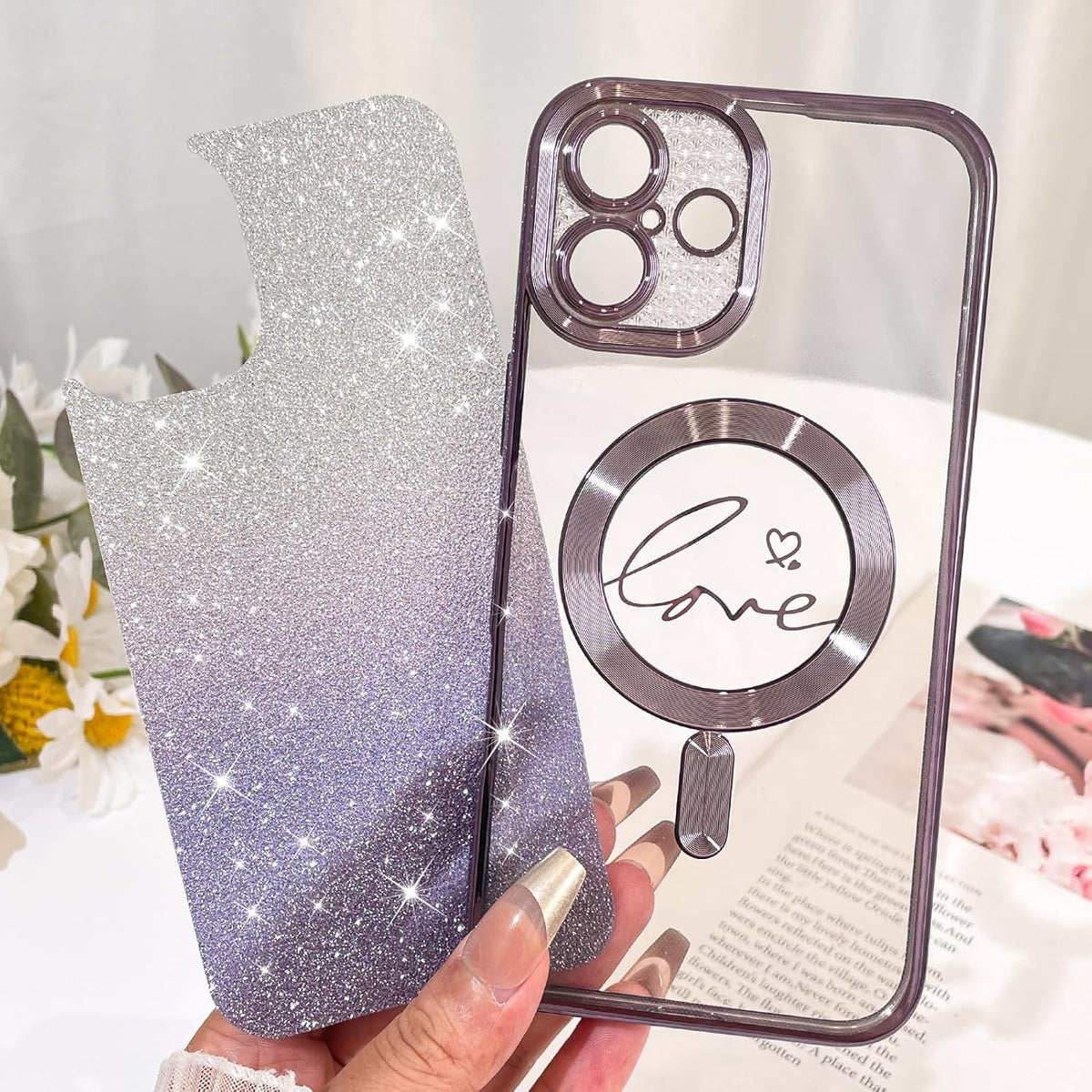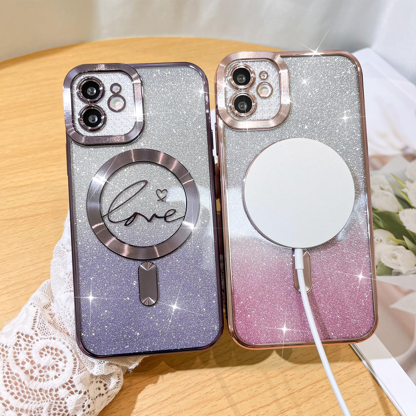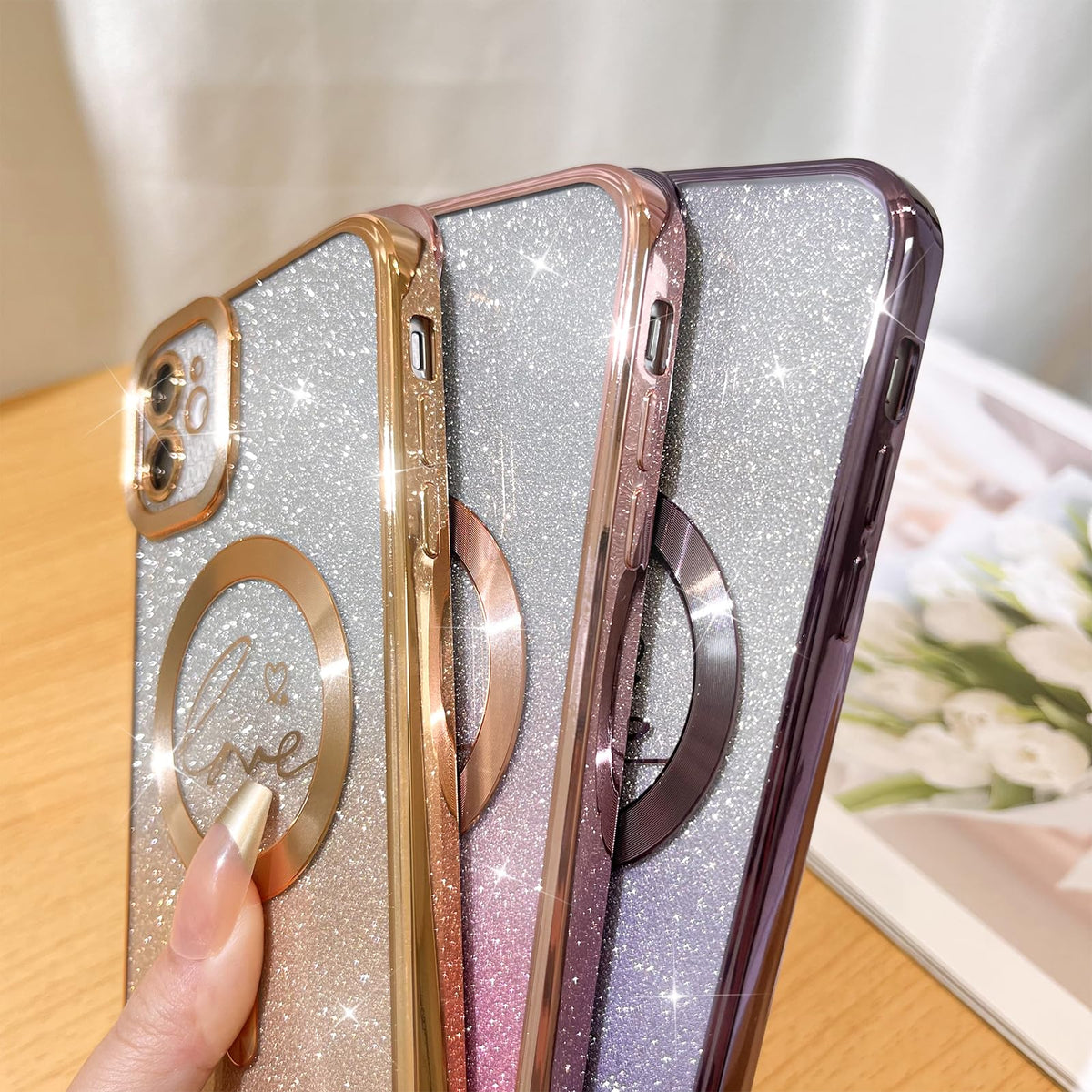 Fiyart Designed For Iphone 15 Case,Compatible With Magsafe Love Heart Plating Camera Protection Clear Phone Case, Magnetic Glitt