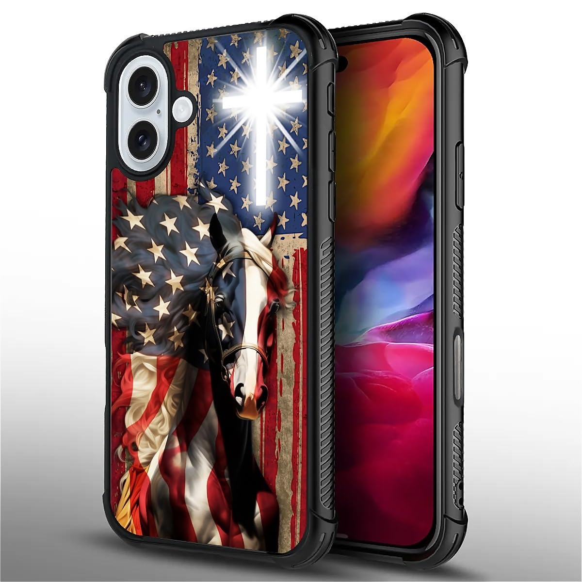 Fkbrcl4U For Iphone 16 Plus Case, Red American Flag Horse Cross Pattern Graphic Design Girl Boy Soft Silicone Hard Acrylic Shock
