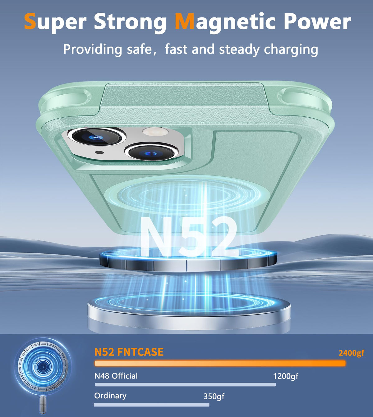 Q: How does the magnetic attraction work with this case?A: The FNTCASE is equipped with 38 super N52 magnets, providing a magnetic attraction that reaches 2400 gf. This allows for compatibility with magnetic chargers and other Qi wireless chargers without any signal interference.