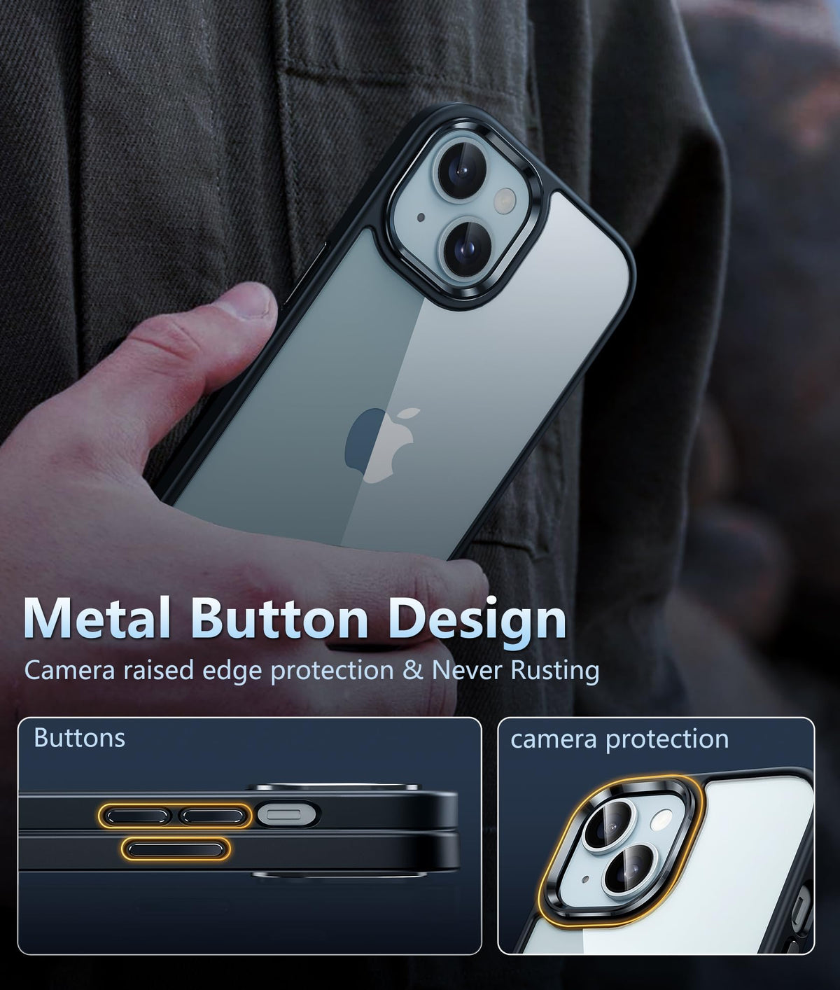 Q: How does the military-grade protection work for the iPhone 15 Plus case?A: The case features a rigid polycarbonate back and flexible TPU bumpers, along with built-in corner airbags that help absorb impact, offering protection against drops and bumps up to 10 feet.
