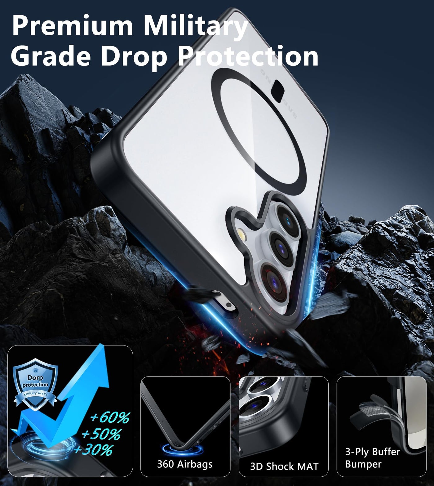 Q: How does the case protect my phone from drops?A: This case offers military-grade full body protection with 4 air-cushioned corners, which absorb impact from accidental bumps and drops, ensuring your phone remains safe.