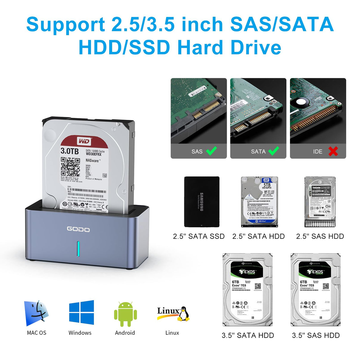 Godo Sas/Sata Hard Drive Docking Station Adapter, 2.5/3.5 Inch Usb 3.0 External Sas Enclosure, Hdd Ssd Converter With 12V/2.5A P