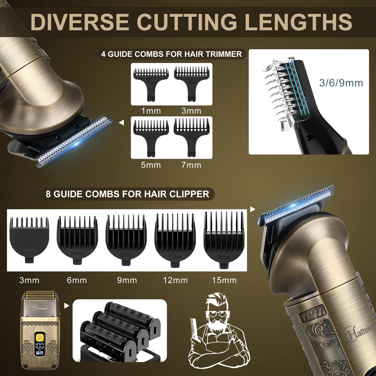 Q: What makes the T-blade of the Hatteker trimmer unique?A: The T-blade of the Hatteker trimmer is zero-gapped, allowing for precise trimming down to 0.3 mm when used without guide combs. This feature is ideal for detailed styling, hard or soft lining, and achieving professional barber-like results, making it perfect for carving hair shapes and bald heads.