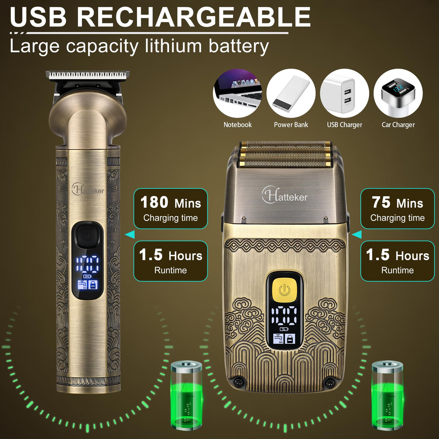 Q: How long does the battery last on the Hatteker grooming kit?A: The Hatteker grooming kit features a built-in rechargeable lithium-ion battery that provides up to 180 minutes of runtime for the hair clipper after a full charge of 1.5 hours. The electric razor offers approximately 75 minutes of shaving time after the same charging duration.