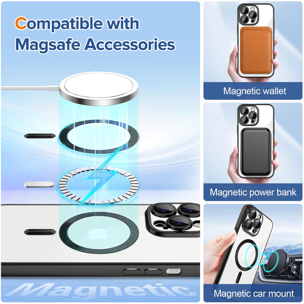 Q: What are the benefits of the built-in magnetic feature in this case?A: The built-in magnetic feature enhances the magnetic connection for compatibility with MagSafe accessories, such as wireless chargers, car mounts, and wallets. This allows for faster and easier wireless charging and a secure attachment for accessories.