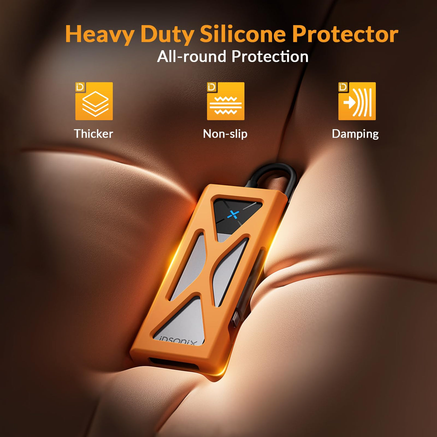 Q: Does the enclosure come with any protective features?A: Yes, the iDsonix M.2 Enclosure is equipped with a heavy-duty silicone protector that is shock-absorbing and anti-slip, providing durability for outdoor usage.